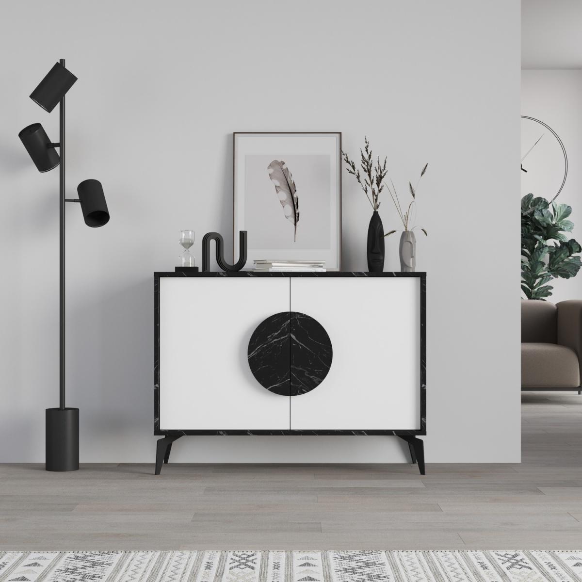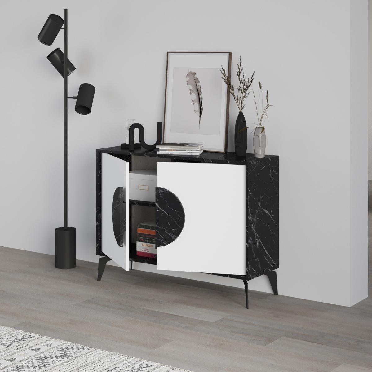 Hey there! Check out this amazing sideboard that will definitely add some style to your room. It's so unique, you'll be sure to get compliments on it. Plus, it's super spacious with dimensions of 110x36x82 cm, so you can store all your belongings and keep your space clutter-free. The sideboard even comes with two cabinets and interior shelves, so you'll have plenty of storage options for all your dinnerware, books, and other essentials. Don't worry about the assembly either - it's easy and fun with clear instructions and all the necessary fittings and fixings included. When it comes to cleaning, just wipe it down with a damp cloth and avoid using any chemicals to keep the protective melamine finish looking great. And the best part? You get a 2-year guarantee from the manufacturer, so you know it's built to last. Just keep in mind that you'll need to secure it properly to prevent any accidents - a tip-over restraint device isn't included. If you have any questions or need any help, just shoot us a message. We're always here to make your experience as smooth as possible.