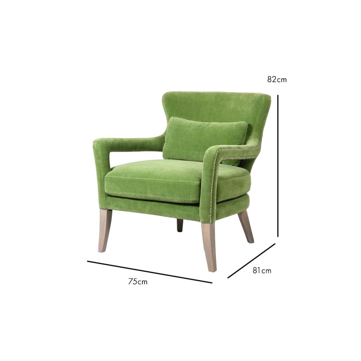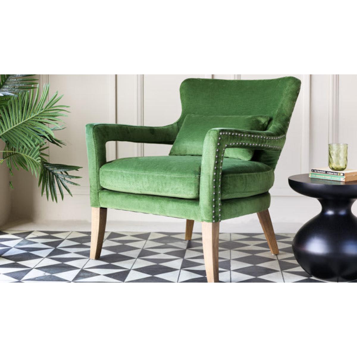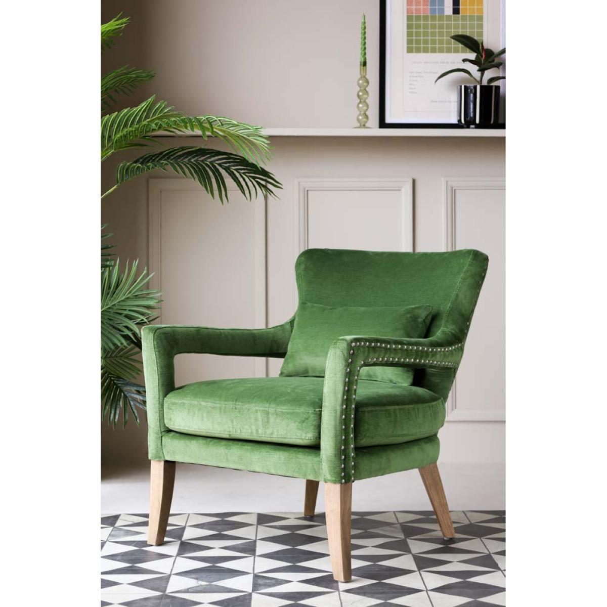 About The Gorgeous Green Velvet Armchair Taking luxe lounging to the next level, the Gorgeous Green Velvet Armchair introduces cosy comfort to any corner of your home. Measuring H82cm x W75cm x D81cm, the armchair features velvet upholstery in a vibrant natural green with antique silver studded details. Designed with premium comfort in mind, the velvet armchair comes complete with a matching green velvet back pillow. Why We Think You’ll Love The Green Velvet ArmchairYou can never have too many places to sit when guests come over so we always recommending creating as many cosy corners as possible when styling your home. Embracing our love of all things green, this modern armchair is crafted in a glorious fresh green colour palette that evokes memories of the natural world, from freshly cut grass to leaves on the forest floor. With pale wood legs and studded upholstery design details, this gorgeous piece of stylish seating is perfect for relaxation. How To Style The Gorgeous Green ArmchairA few of our favourite spots for the Gorgeous Green Velvet Armchair include your living spaces for curling up with a glass of wine and the bedroom for sinking into when you need a moment of peace. However, the green velvet armchair looks great anywhere and can also be styled in the corner of the kitchen or next to a mirror in the hallway to create a statement style spot!