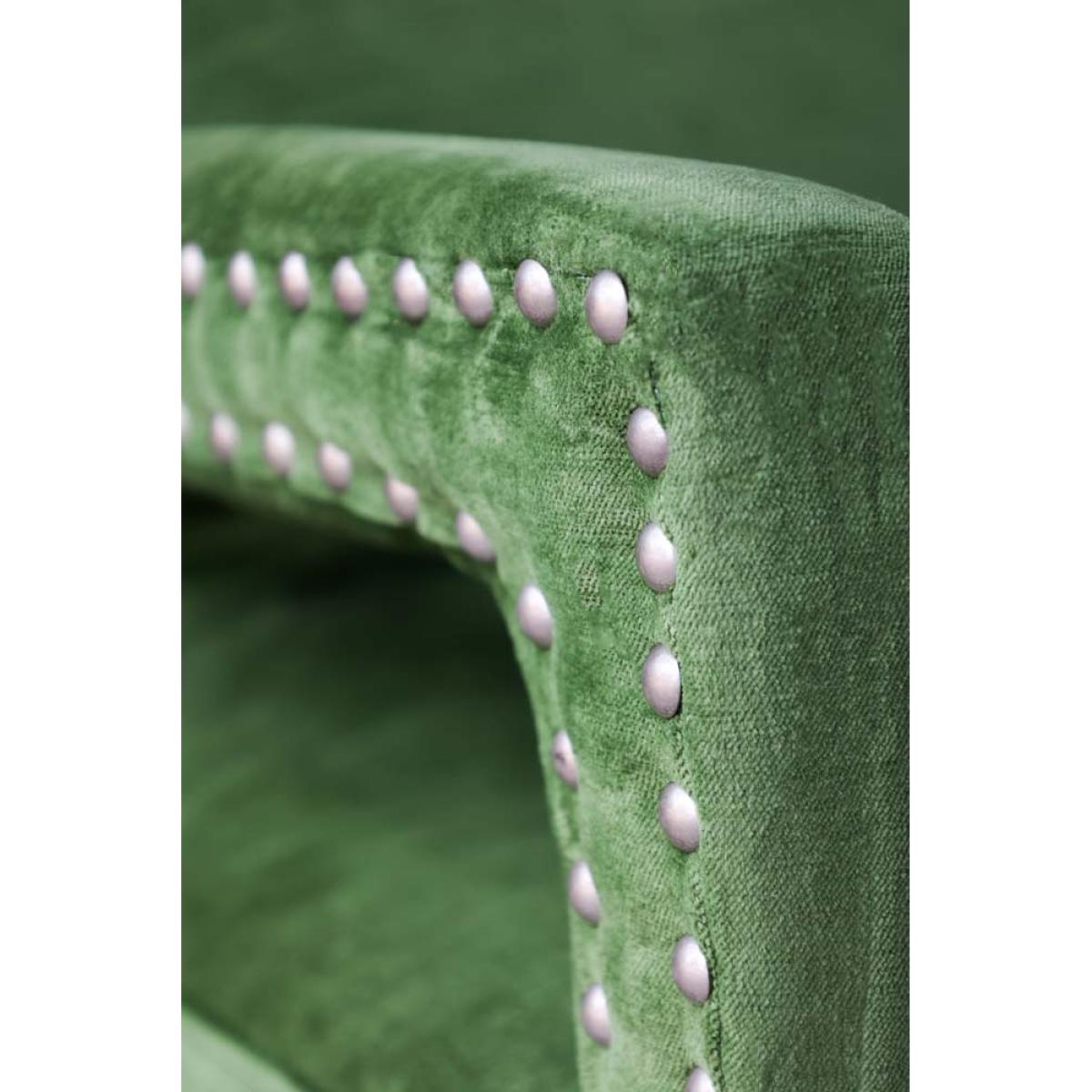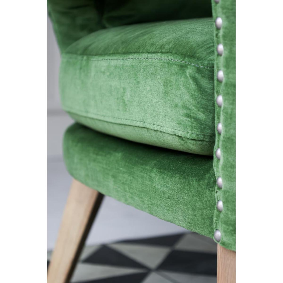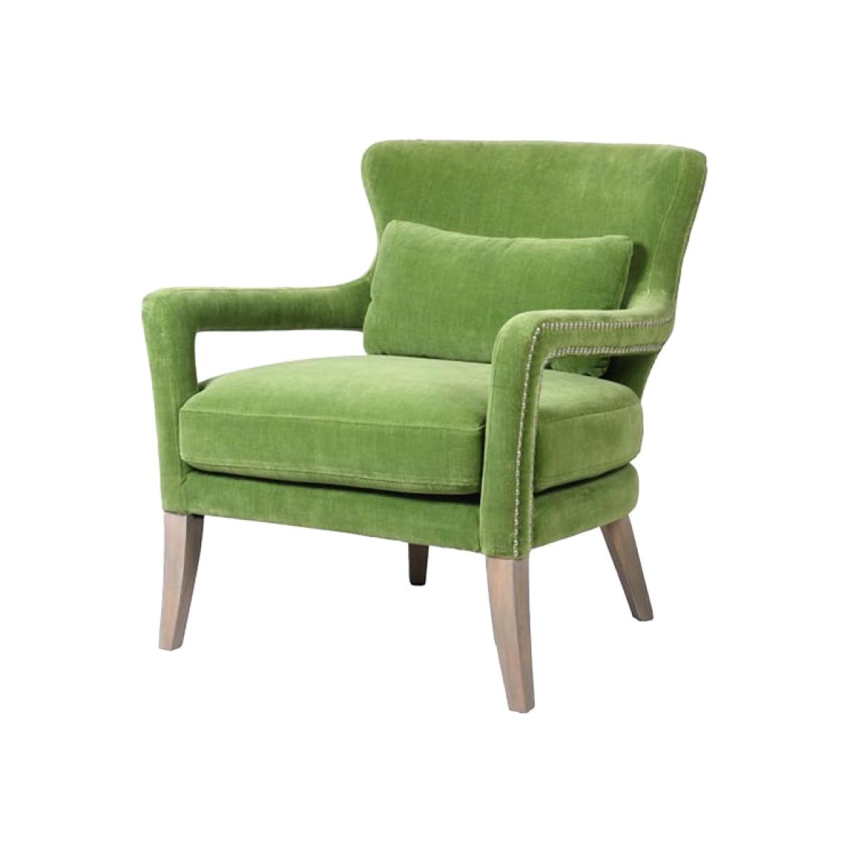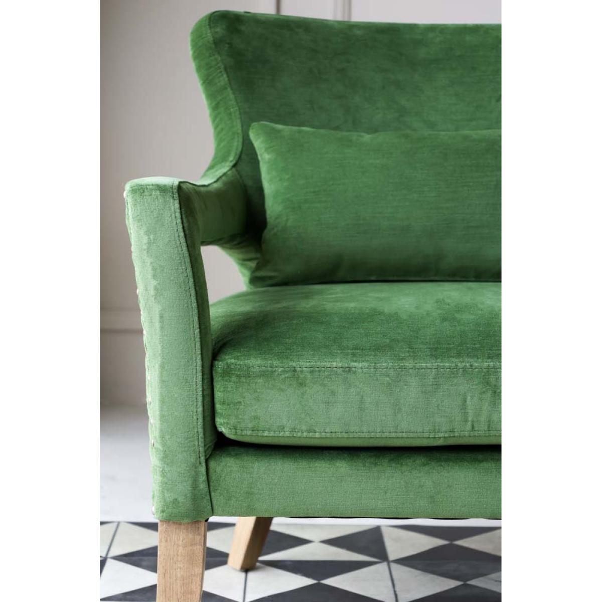 About The Gorgeous Green Velvet Armchair Taking luxe lounging to the next level, the Gorgeous Green Velvet Armchair introduces cosy comfort to any corner of your home. Measuring H82cm x W75cm x D81cm, the armchair features velvet upholstery in a vibrant natural green with antique silver studded details. Designed with premium comfort in mind, the velvet armchair comes complete with a matching green velvet back pillow. Why We Think You’ll Love The Green Velvet ArmchairYou can never have too many places to sit when guests come over so we always recommending creating as many cosy corners as possible when styling your home. Embracing our love of all things green, this modern armchair is crafted in a glorious fresh green colour palette that evokes memories of the natural world, from freshly cut grass to leaves on the forest floor. With pale wood legs and studded upholstery design details, this gorgeous piece of stylish seating is perfect for relaxation. How To Style The Gorgeous Green ArmchairA few of our favourite spots for the Gorgeous Green Velvet Armchair include your living spaces for curling up with a glass of wine and the bedroom for sinking into when you need a moment of peace. However, the green velvet armchair looks great anywhere and can also be styled in the corner of the kitchen or next to a mirror in the hallway to create a statement style spot!