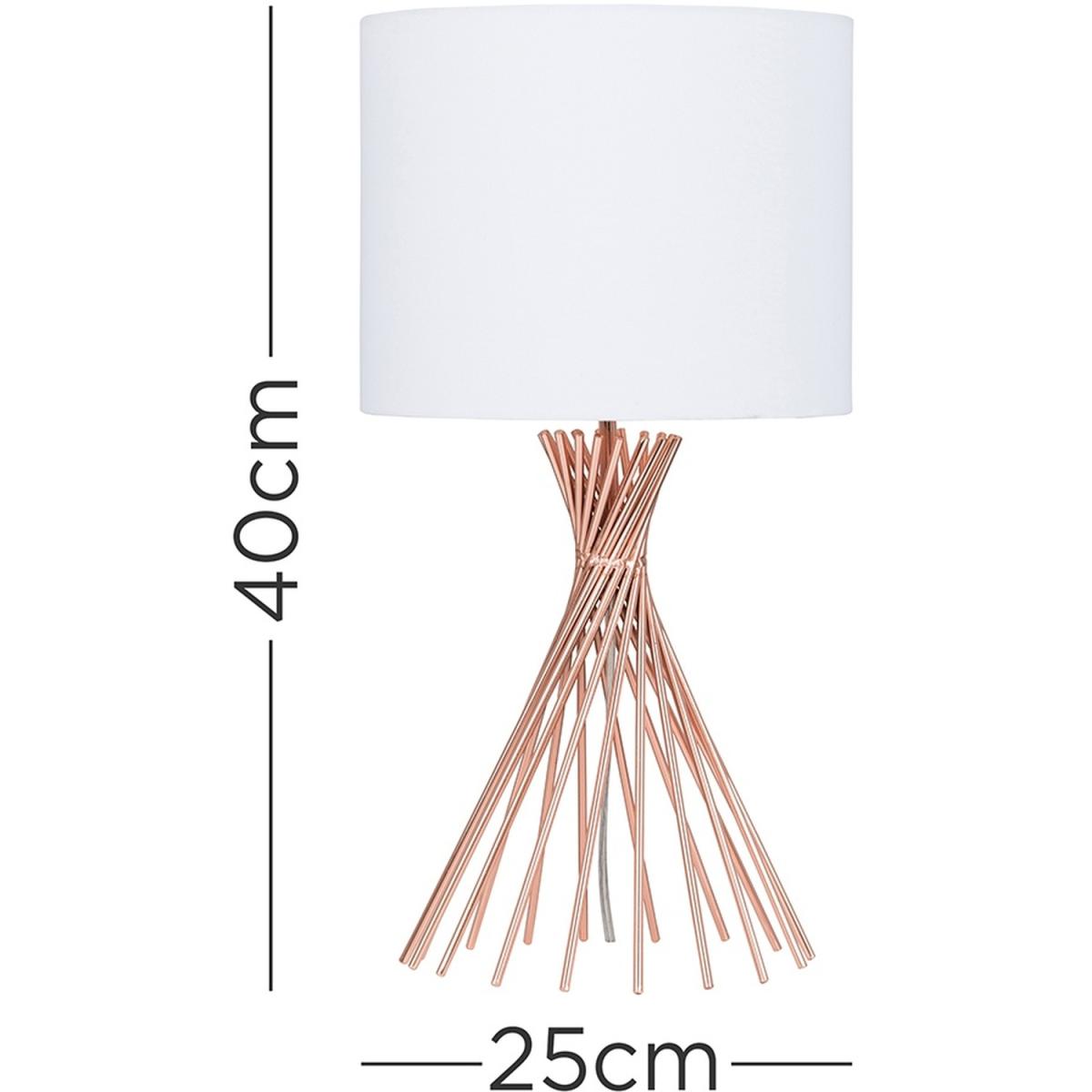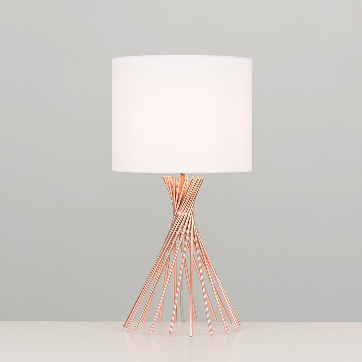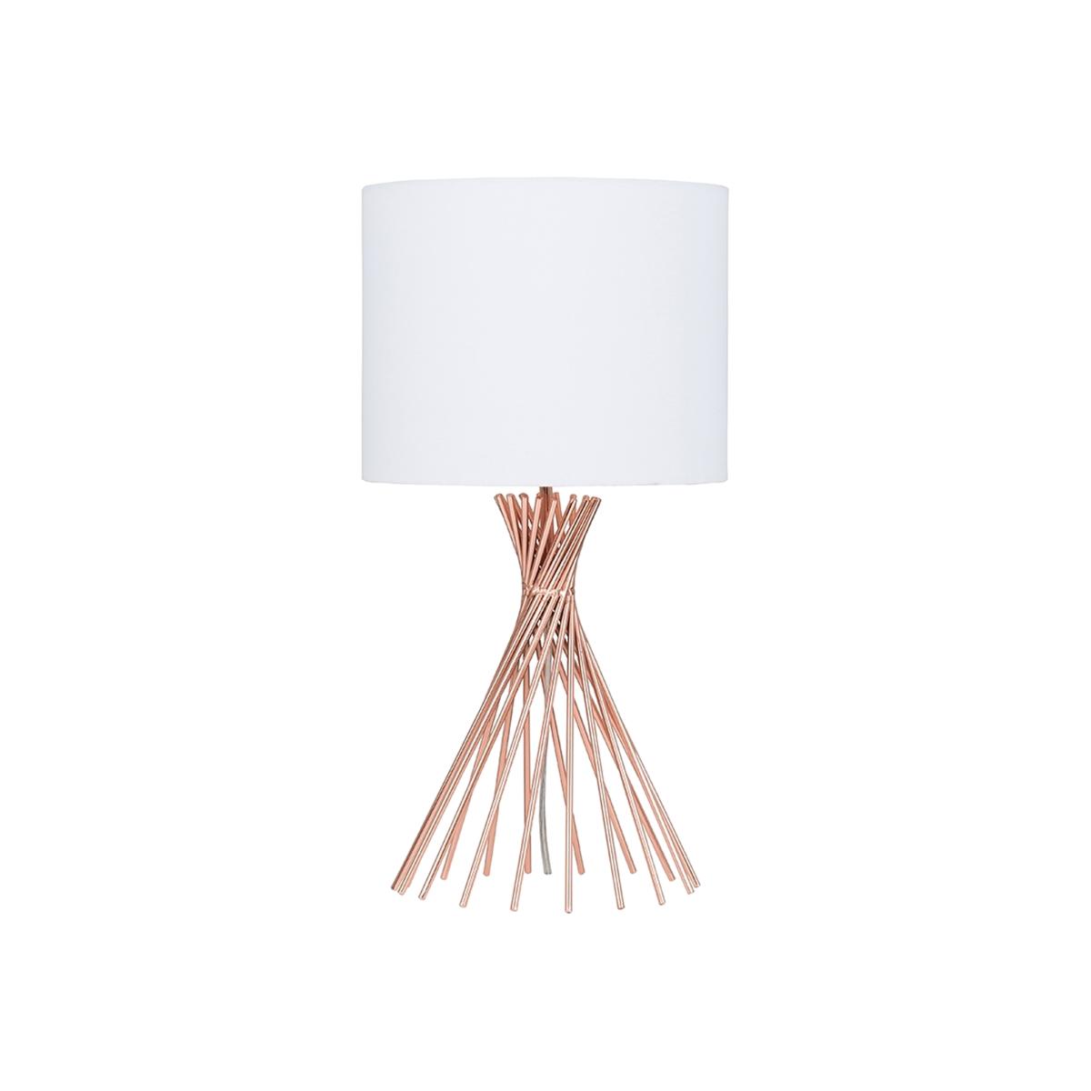 Modern twisted metal wire design table lamp in a copper effect finish, complete with a white fabric cylinder lamp shade. Features an in-line onoff switch for easy use. Table lamps are a great way to bring additional lighting to a room or you can use them reduce your main light output, and create a more relaxing moodatmosphere.