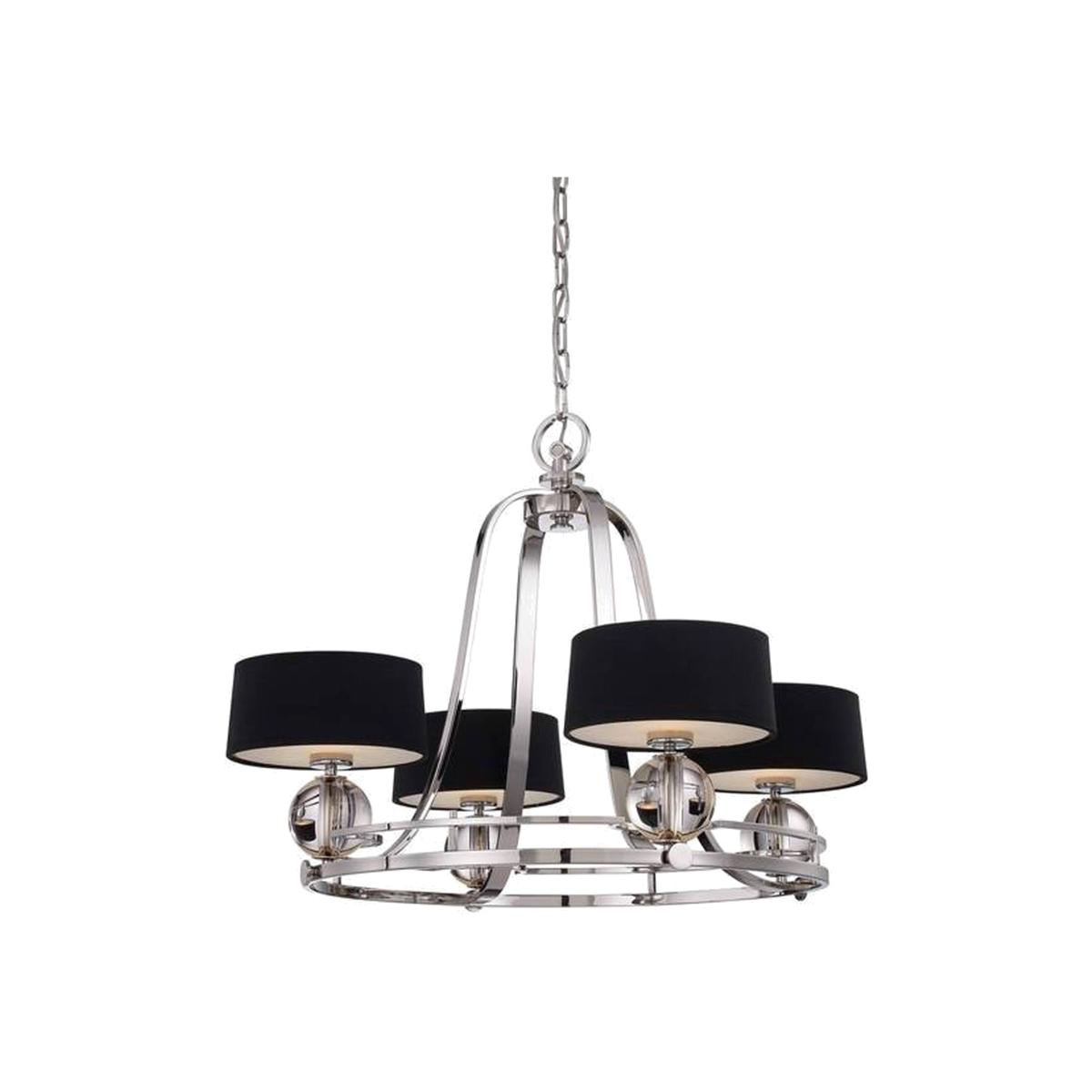 Inspired by the rich, powerful lights within the shadows of Manhattan, this 4 light chandelier comes alive defying darkness. The Imperial Silver effect finish is completed by black shades with glass diffusers for a chic, sophisticated look. Also available in this range 1lt Wall Light, and Pendant.