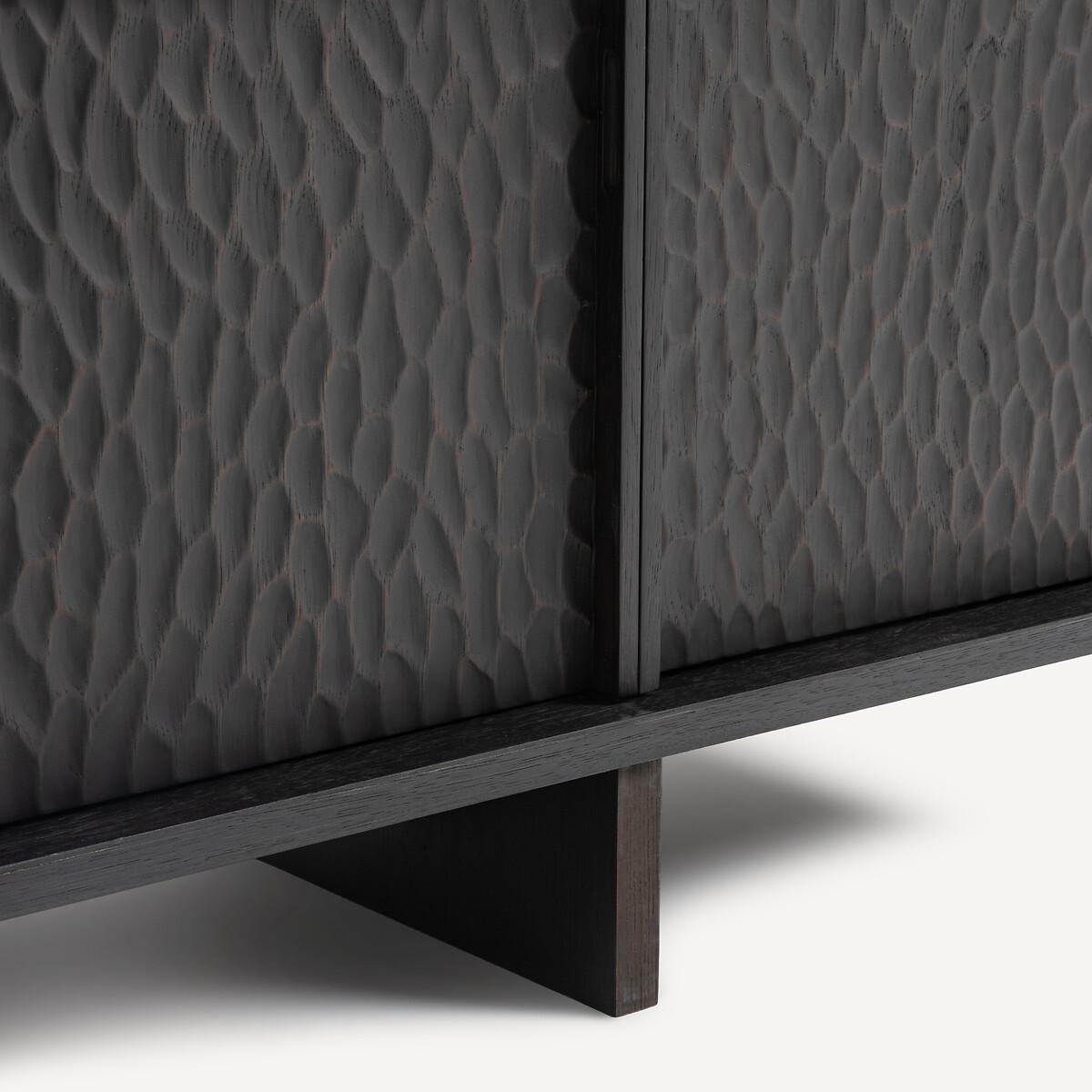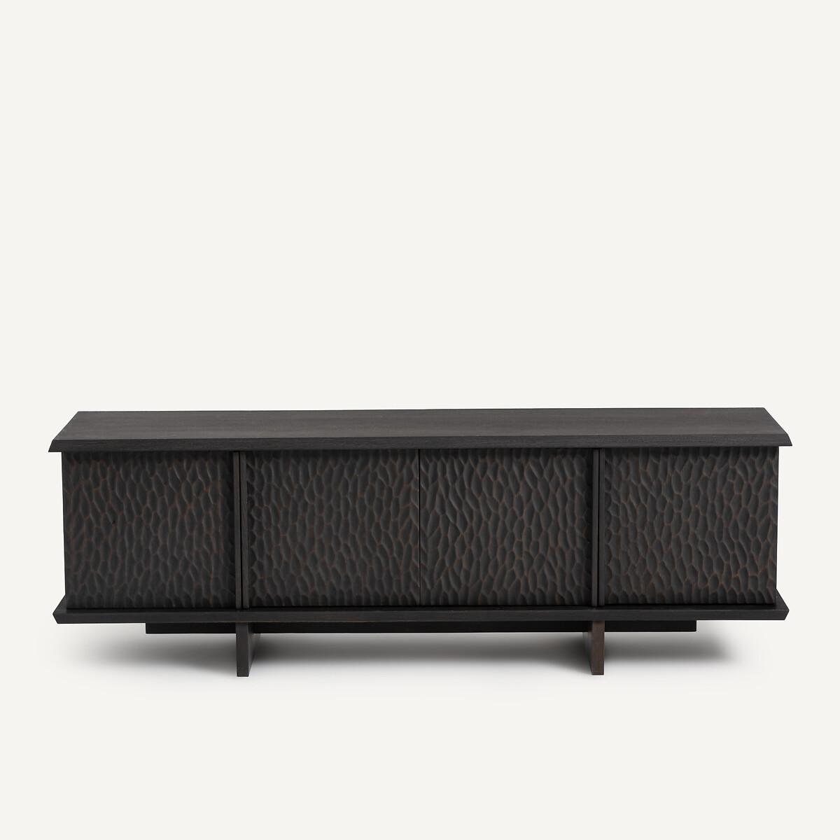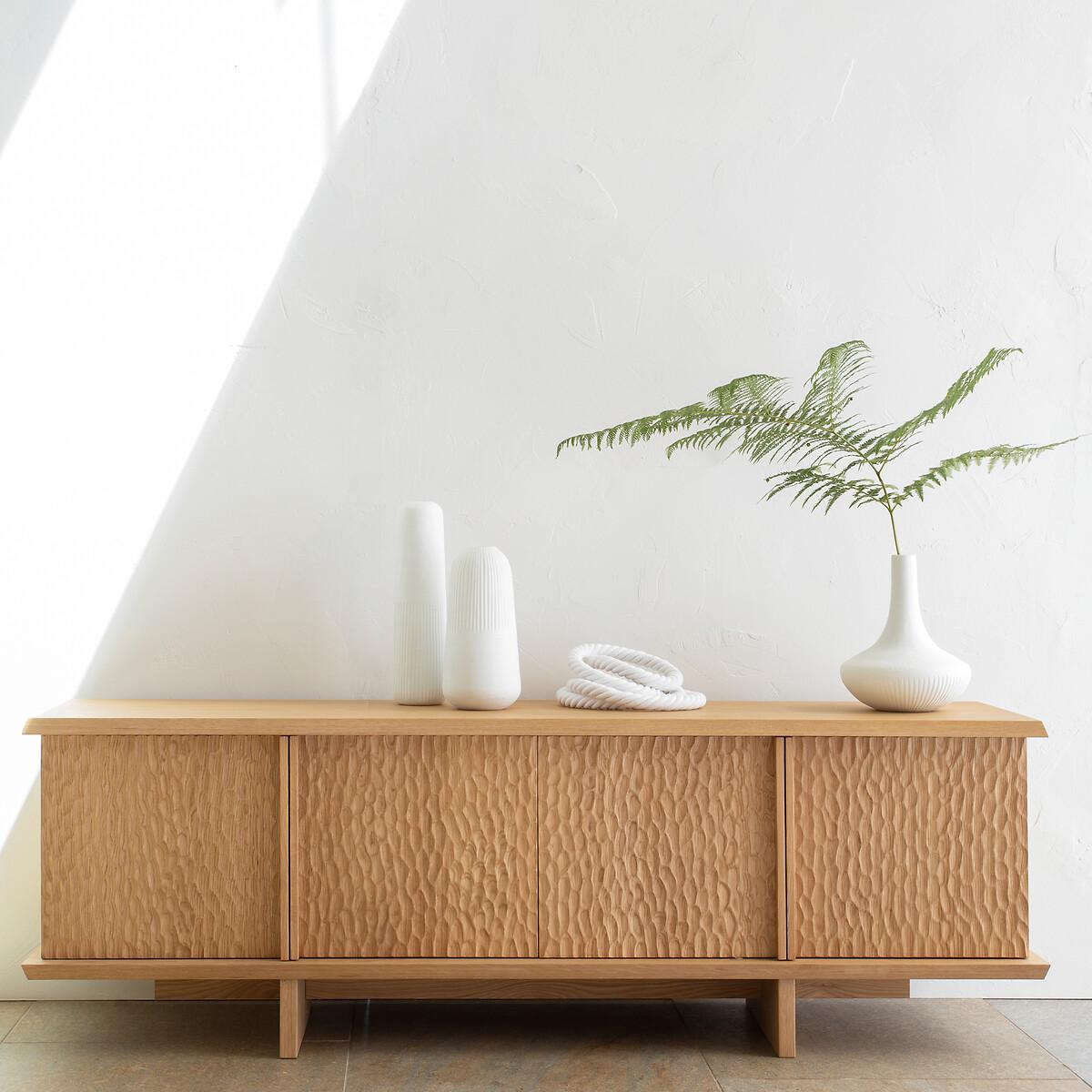 Simple and refined, the Gouge sideboard combines contemporary spirit and traditional craftsmanship. Bevelled tops, a central crosspiece and an interlocking base... smart characteristics that define the modern and timeless design of this piece of furniture. The texture on the four doors recalls the sculpture effect caused by the gouge, a tool used by cabinetmakers.. Made from solid oak and oak veneer, wood from environmentally well-managed forests. A beautiful and functional sideboard by AMPM.Product Details • Oak veneered MDF cabinet and shelves • Solid oak doors, legs and bevelled edges • FSC® Mixed certified wood • Polyurethane varnish finish • Facade of the doors carved with a gouge • Soft-close doors • 4 compartments formed by 2 removable and adjustable interior shelves • 2 cable entry slots. Quality Info • This furniture is equipped with German brand hardware: reliable, discreet and functional. These accessories ensure the longevity of your product. • Soft-closing : system for closing doors smoothly, silently, also preventing fingers from getting caught. • Wood is a living material. The differences in shades, grains and knots reinforce its character and authenticity.. Over time it may crack slightly. It is a process caused by variations in temperature and humidity. Dimensions. Overall • Width: 180cm • Height: 60cm • Depth: 46cm. Usable dimensions • Compartment (without shelf): L84 x H39 x D37cm • Sold pre-assembled. • WOOD FROM MORE SUSTAINABLY MANAGED FORESTS AND CONTROLLED SOURCES. FSC® Mix wood contains at least 70% FSC® certified and/or recycled wood, the remainder being FSC® controlled wood. Dimensions and weight of parcel2 parcels • L152 x H15 x D48cm. 18kg • L198 x H57 x D55cm. 66kg
