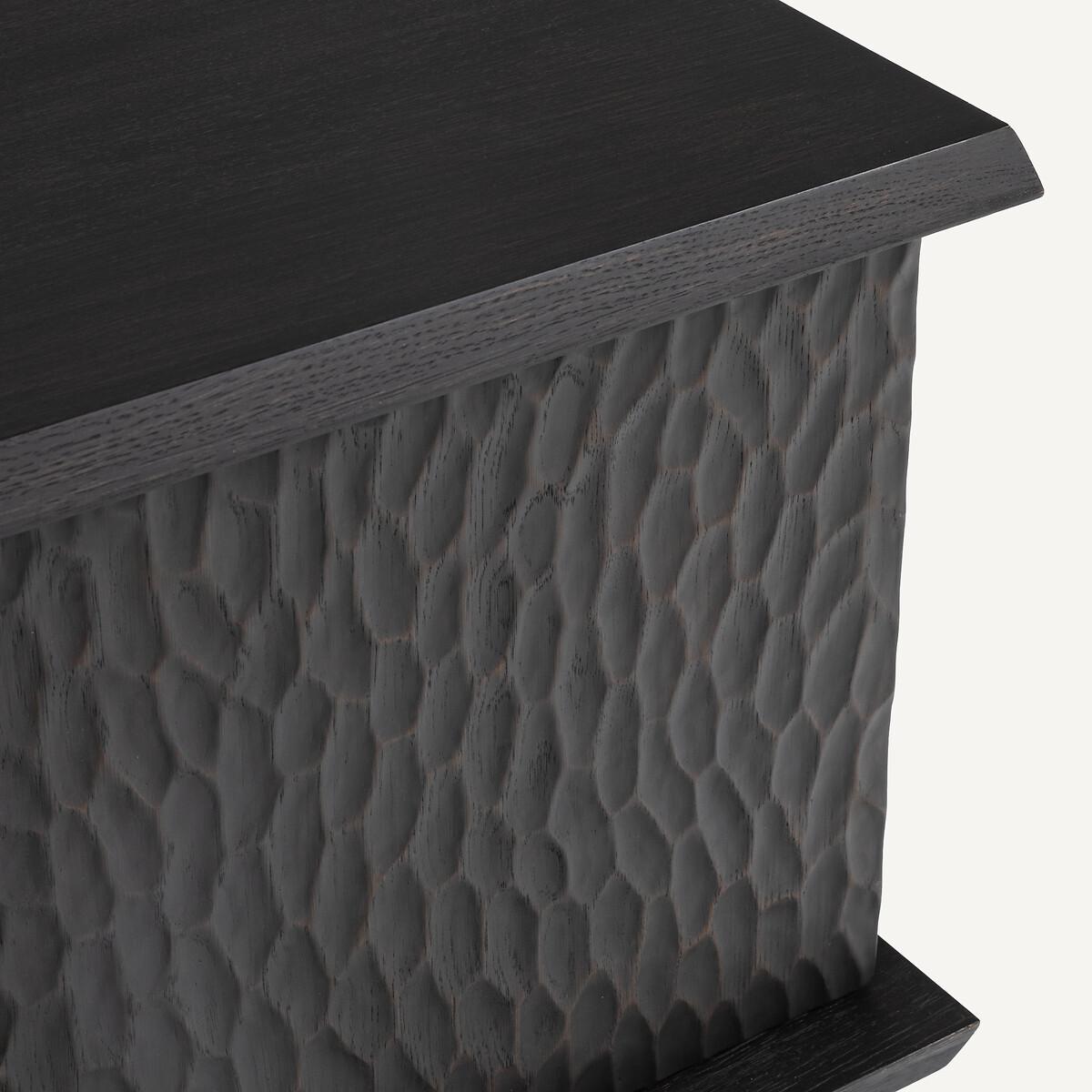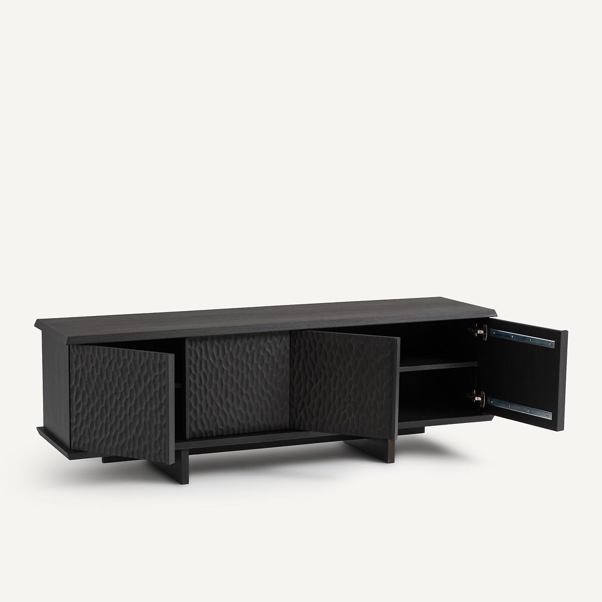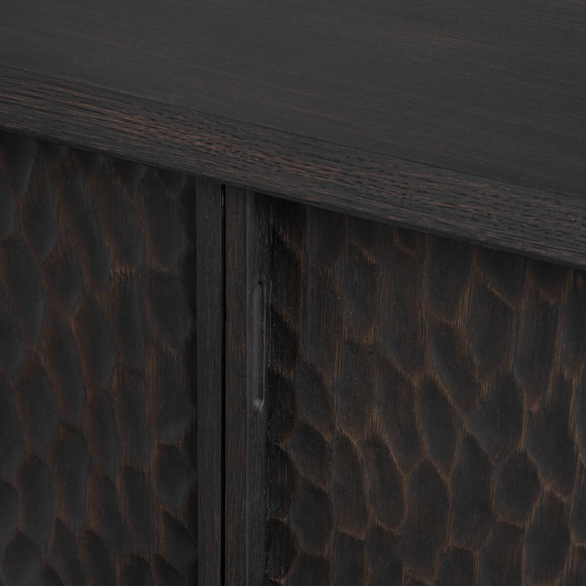 Simple and refined, the Gouge sideboard combines contemporary spirit and traditional craftsmanship. Bevelled tops, a central crosspiece and an interlocking base... smart characteristics that define the modern and timeless design of this piece of furniture. The texture on the four doors recalls the sculpture effect caused by the gouge, a tool used by cabinetmakers.. Made from solid oak and oak veneer, wood from environmentally well-managed forests. A beautiful and functional sideboard by AMPM.Product Details • Oak veneered MDF cabinet and shelves • Solid oak doors, legs and bevelled edges • FSC® Mixed certified wood • Polyurethane varnish finish • Facade of the doors carved with a gouge • Soft-close doors • 4 compartments formed by 2 removable and adjustable interior shelves • 2 cable entry slots. Quality Info • This furniture is equipped with German brand hardware: reliable, discreet and functional. These accessories ensure the longevity of your product. • Soft-closing : system for closing doors smoothly, silently, also preventing fingers from getting caught. • Wood is a living material. The differences in shades, grains and knots reinforce its character and authenticity.. Over time it may crack slightly. It is a process caused by variations in temperature and humidity. Dimensions. Overall • Width: 180cm • Height: 60cm • Depth: 46cm. Usable dimensions • Compartment (without shelf): L84 x H39 x D37cm • Sold pre-assembled. • WOOD FROM MORE SUSTAINABLY MANAGED FORESTS AND CONTROLLED SOURCES. FSC® Mix wood contains at least 70% FSC® certified and/or recycled wood, the remainder being FSC® controlled wood. Dimensions and weight of parcel2 parcels • L152 x H15 x D48cm. 18kg • L198 x H57 x D55cm. 66kg