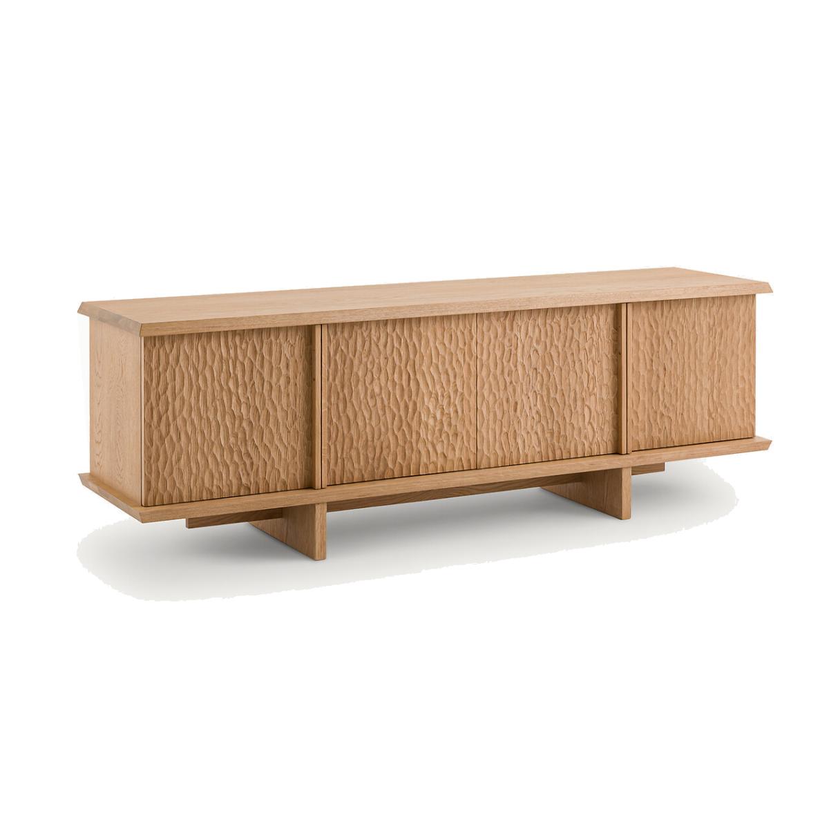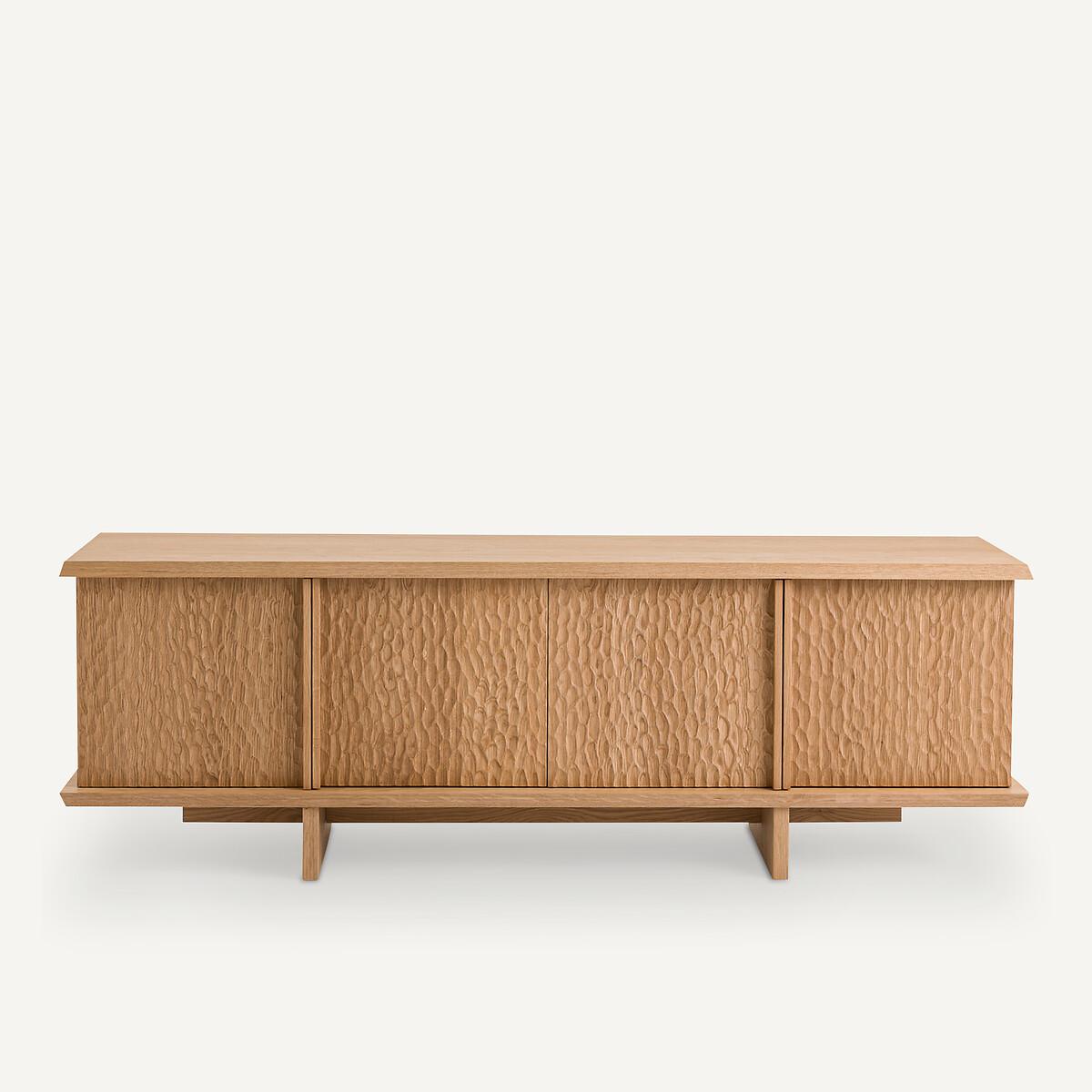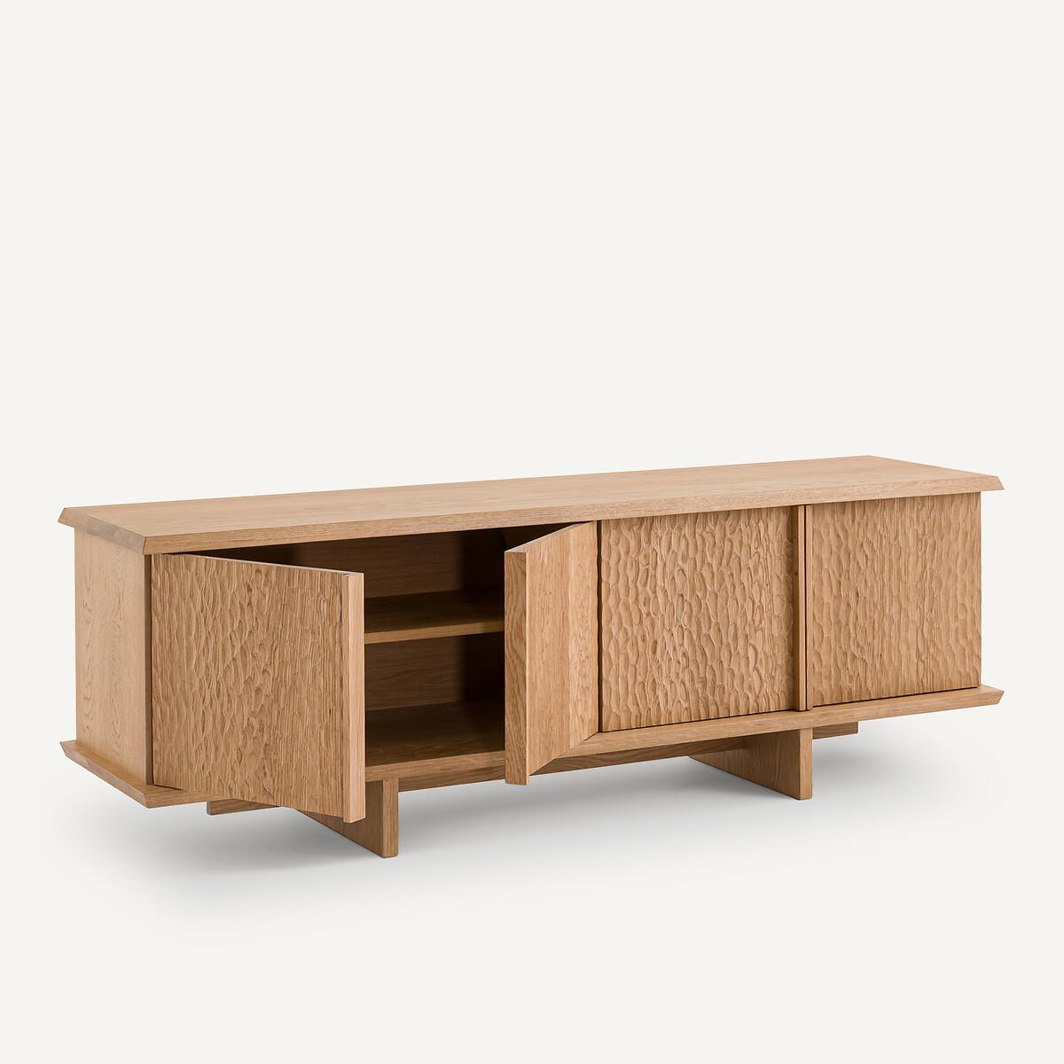 Simple and refined, the Gouge sideboard combines contemporary spirit and traditional craftsmanship. Bevelled tops, a central crosspiece and an interlocking base... smart characteristics that define the modern and timeless design of this piece of furniture. The texture on the four doors recalls the sculpture effect caused by the gouge, a tool used by cabinetmakers.. Made from solid oak and oak veneer, wood from environmentally well-managed forests. A beautiful and functional sideboard by AMPM.Product Details • Oak veneered MDF cabinet and shelves • Solid oak doors, legs and bevelled edges • Polyurethane varnish finish • Facade of the doors carved with a gouge • Soft-close doors • 4 compartments formed by 2 removable and adjustable interior shelves • 2 cable entry slots. Quality Info • This furniture is equipped with German brand hardware: reliable, discreet and functional. These accessories ensure the longevity of your product. • Soft-closing : system for closing doors smoothly, silently, also preventing fingers from getting caught. • Wood is a living material. The differences in shades, grains and knots reinforce its character and authenticity.. Over time it may crack slightly. It is a process caused by variations in temperature and humidity. Dimensions. Overall • Width: 180cm • Height: 60cm • Depth: 46cm. Usable dimensions • Compartment (without shelf): L84 x H39 x D37cm • Sold pre-assembled. • WOOD FROM MORE SUSTAINABLY MANAGED FORESTS AND CONTROLLED SOURCES. FSC® Mix wood contains at least 70% FSC® certified and/or recycled wood, the remainder being FSC® controlled wood. Dimensions and weight of parcel2 parcels • L152 x H15 x D48cm. 18kg • L198 x H57 x D55cm. 66kg