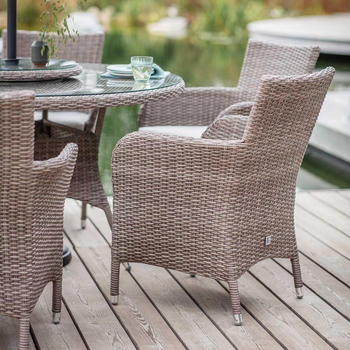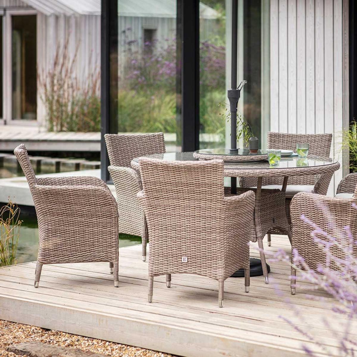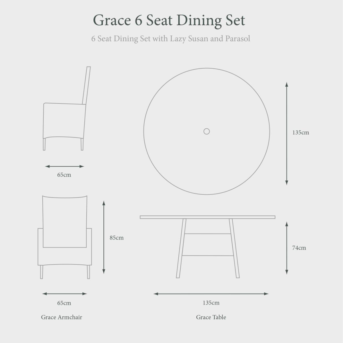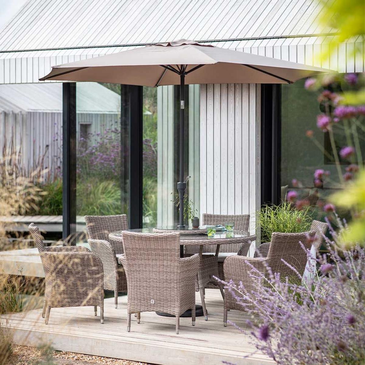 If you enjoy entertaining outdoors, our all-weather Grace 6 Seat Dining Set with Lazy Susan and Parasol is the perfect choice for sociable lunches, barbecues and dinner with family and friends. The large parasol offers shade and protection from the sun while the circular Lazy Susan turntable allows guests to share dishes easily when dining together. Our Grace range is a modern classic in stylish, realistic beige rattan-effect, with high back seats and elegantly curved arms for comfort and support. This classic style will look great in your outdoor space for years to come. Cushions are UV resistant, water repellent and quick to dry after a summer shower so you can leave this set outside all season. The bull-nosed curved edge cushions come with removable zipped covers for easy cleaning, making this set low maintenance and easy to keep looking good as new. The realistic rattan-effect design is made from polymer Ever. Weave, which can easily be cleaned up at the start of each season to keep this set looking as good as new, while the tabletop has a 5mm safety glass top for peace of mind.