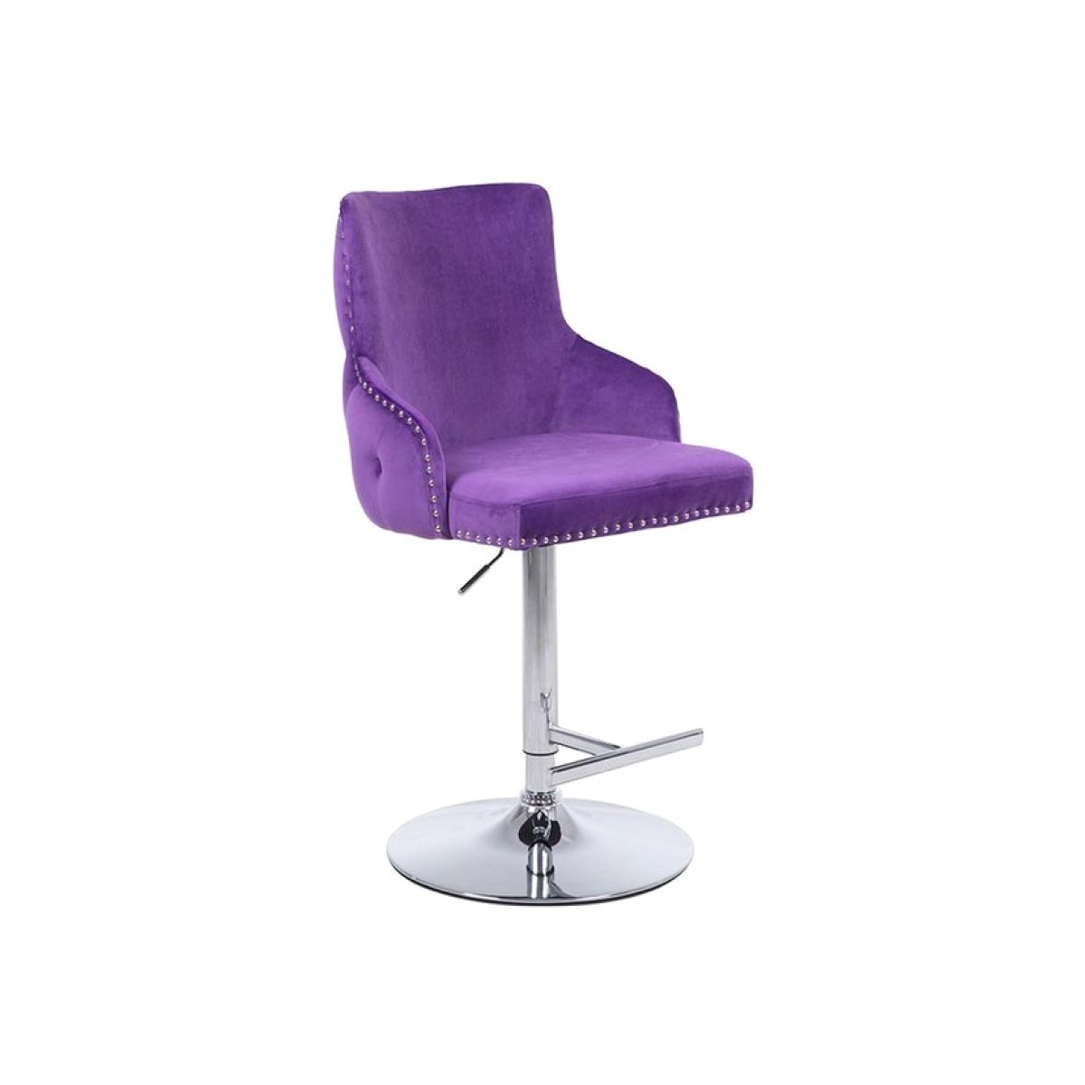 This purple barstool is a fantastic choice for adding colour and personality to a contemporary or eclectic space. I love its bold hue, which works particularly well in kitchens or home bars that feature neutral palettes, as it acts as a statement piece. The plush upholstery and subtle nailhead detailing give it a slightly luxe feel, making it versatile for both casual and more refined interiors. For styling tips, pair it with sleek marble or wooden surfaces to create contrast, and consider using it to inject colour into more neutral colour schemes. It’s also practical for smaller spaces, as its height adjustment and swivel function add to its comfort and flexibility.