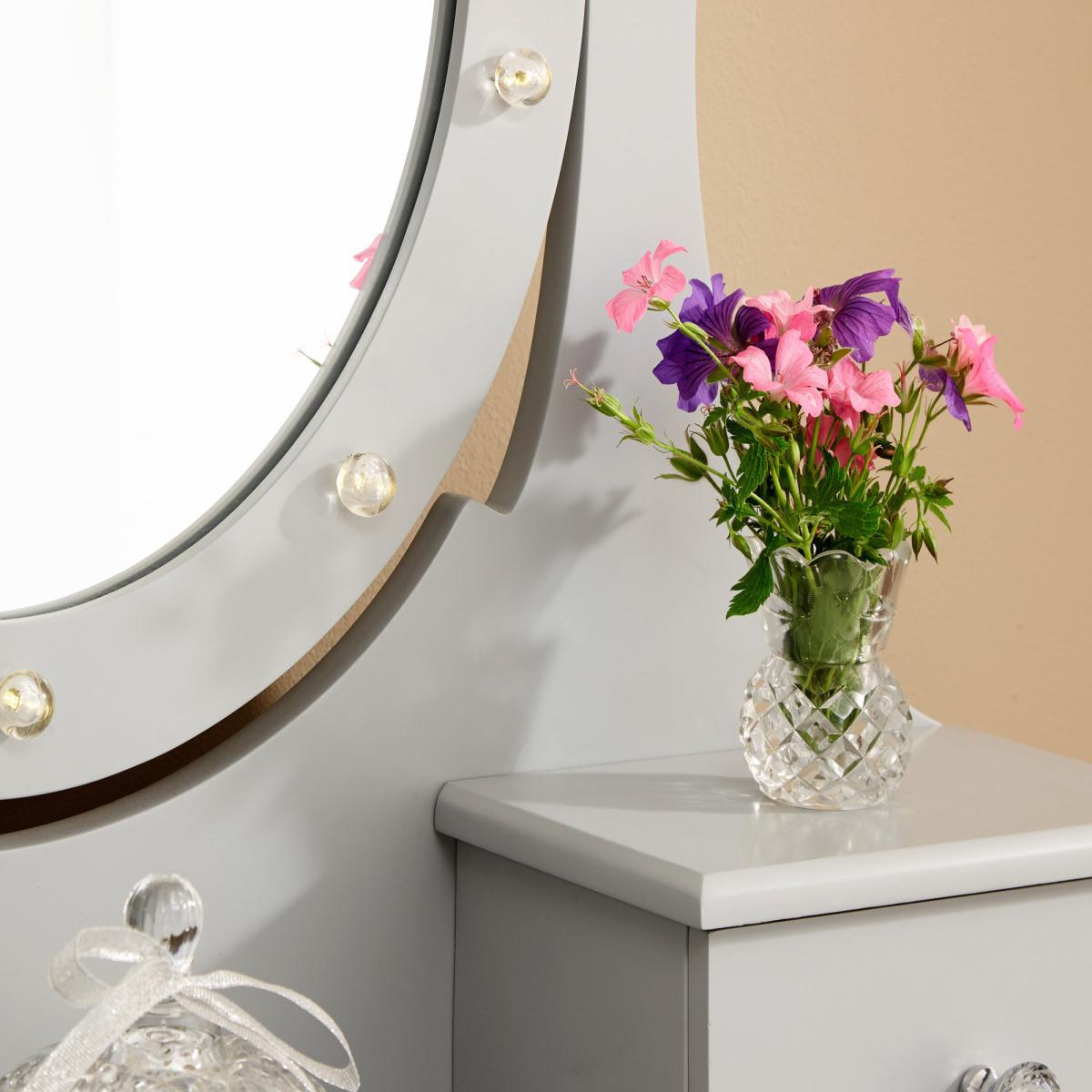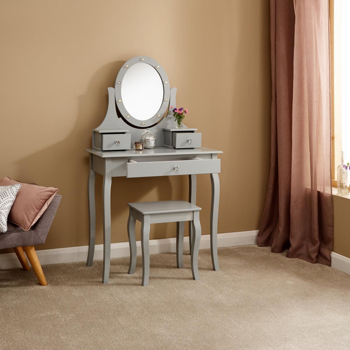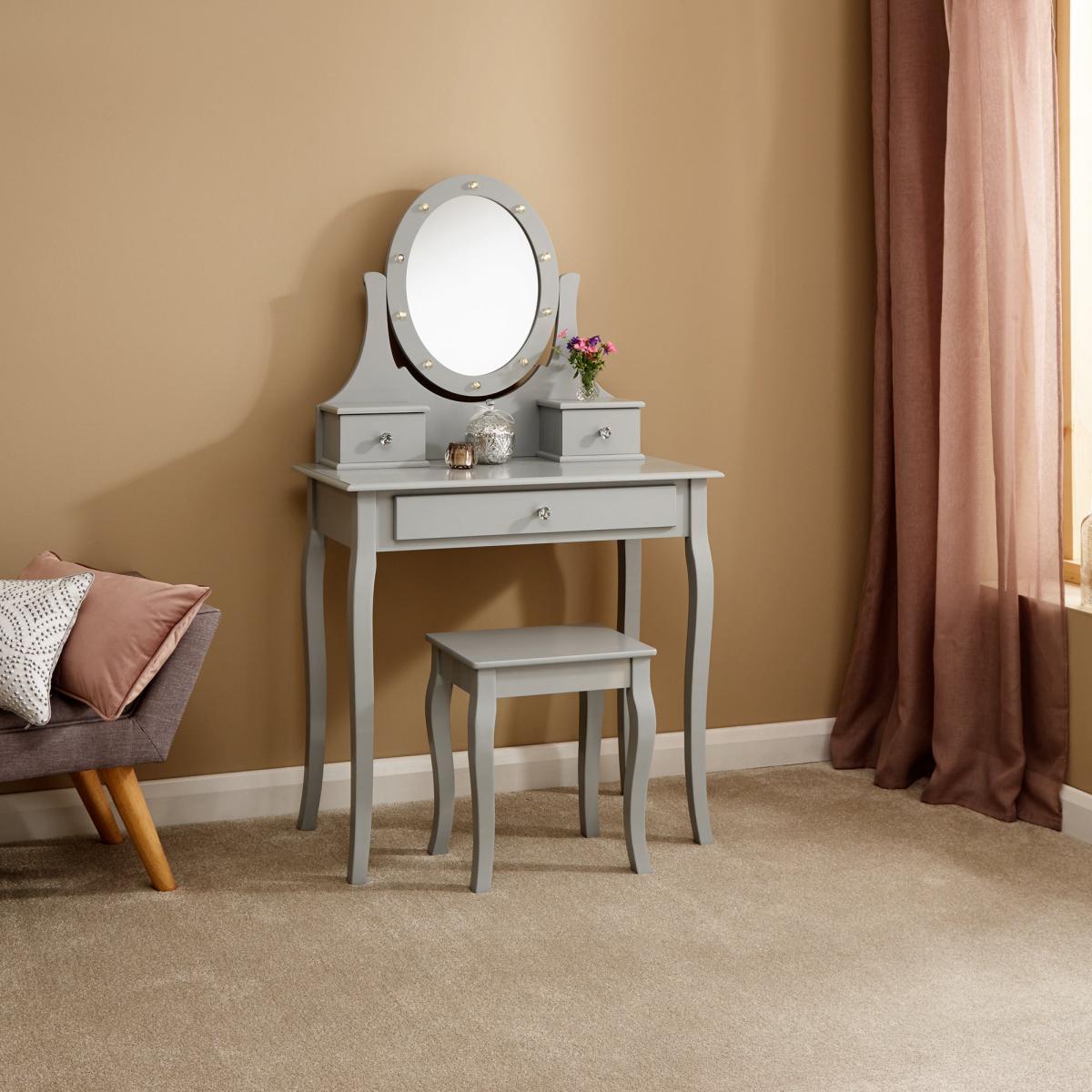 Combining antique styling and modern features, this easy-assemble Grace LED Dressing Table is a stunning addition to any bedroom décor. Available in either a white or grey colourway, this dressing table features hidden storage space, a stool, and an in-built LED mirror that creates a calming halo of light. Requires 2xA. A batteries, not supplied. Please note, unfortunately we cannot deliver this item to Northern Ireland or the Channel Islands.