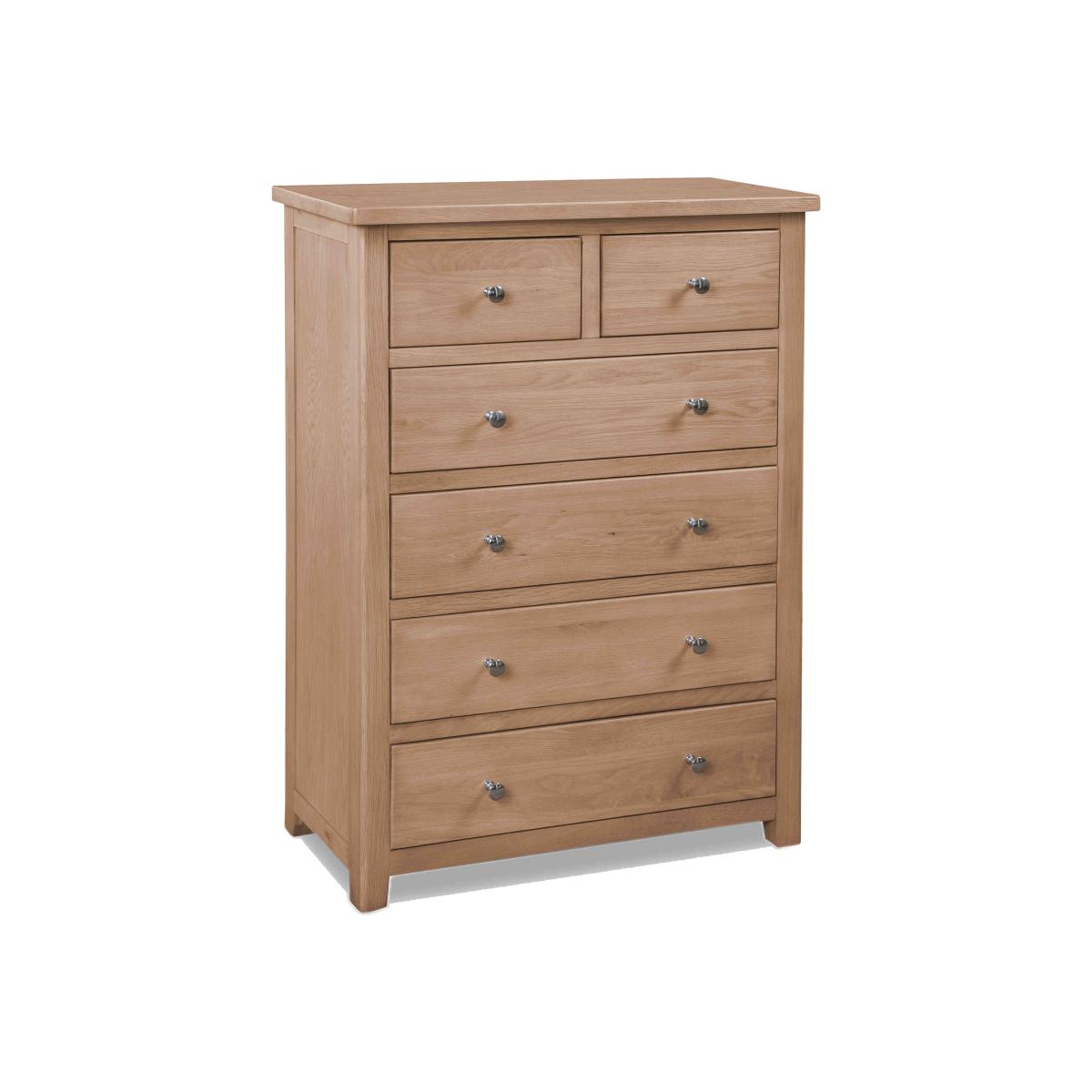 Introducing the Grace bedroom range—your ultimate storage saviour. Say hello to stylish organisation that won’t break the bank. This range is your go-to for creating a cosy, clutter-free space that’s as chic as it is functional. With an array of options from bed frames and wardrobes to chests of drawers and bedside cabinets, it’s your one-stop-shop for transforming your room. You can have it your way, too, with plenty of options to choose from. Solid pine or oak veneers? The choice is yours. Plus, you can take your pick from a palette of 5 stunning finishes to match your vibe. Take your storage game up a notch with this great-value range of bedroom furniture. Effortlessly organise with this stylish chest of drawers featuring two smaller drawers atop four larger ones. Good looks and spacious storage; what’s not to love? Why you'll love it Understated design that fits a range of interiors. Hand-finished with real oak veneers for a quality touch. Pick from five different finishes to suit your style. You’ll have plenty of storage options with this spacious piece. Extra strong dovetail jointed drawer fronts. This chest of drawers is part of the extensive Grace bedroom furniture range. What you need to know Knots, filled knots, and other markings are to be expected. Avoid placing in direct sunlight or close to a heat source. Love the look? Be sure to browse the rest of the Grace bedroom range.