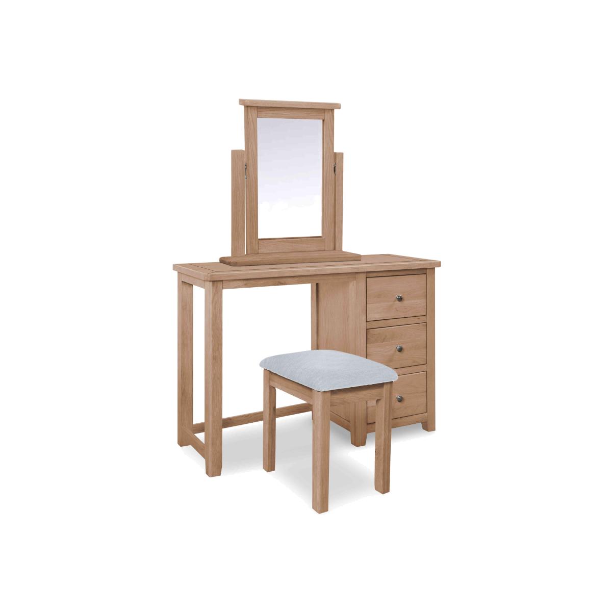 Introducing the Grace bedroom range—your ultimate storage saviour. Say hello to stylish organisation that won’t break the bank. This range is your go-to for creating a cosy, clutter-free space that’s as chic as it is functional. With an array of options from bed frames and wardrobes to chests of drawers and bedside cabinets, it’s your one-stop-shop for transforming your room. You can have it your way, too, with plenty of options to choose from. Solid pine or oak veneers? The choice is yours. Plus, you can take your pick from a palette of 5 stunning finishes to match your vibe. Take your storage game up a notch with this great-value range of bedroom furniture. The ultimate addition to your personal sanctuary, this all-inclusive dressing table set comes with a comfy stool and handy mirror, offering an inviting space for your beauty routine. Why you'll love it Understated design that fits a range of interiors. Hand-finished with real oak veneers for a quality touch. Pick from five different finishes to suit your style. The perfect setup for getting ready in style, with a comfy stool and handy mirror. Extra strong dovetail jointed drawer fronts. This dressing table, stool and mirror set is part of the extensive Grace bedroom furniture range. What you need to know Knots, filled knots, and other markings are to be expected. Avoid placing in direct sunlight or close to a heat source. Love the look? Be sure to browse the rest of the Grace bedroom range.