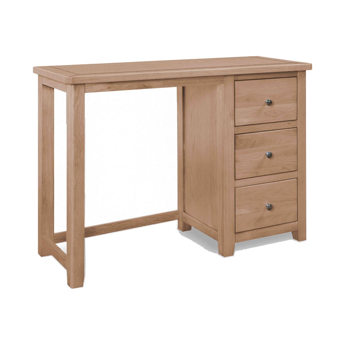 Introducing the Grace bedroom range—your ultimate storage saviour. Say hello to stylish organisation that won’t break the bank. This range is your go-to for creating a cosy, clutter-free space that’s as chic as it is functional. With an array of options from bed frames and wardrobes to chests of drawers and bedside cabinets, it’s your one-stop-shop for transforming your room. You can have it your way, too, with plenty of options to choose from. Solid pine or oak veneers? The choice is yours. Plus, you can take your pick from a palette of 5 stunning finishes to match your vibe. Take your storage game up a notch with this great-value range of bedroom furniture. With convenient storage for your beauty essentials, this dressing table takes the hassle out of getting ready, so you can focus on looking your best every day. Why you'll love it Understated design that fits a range of interiors. Hand-finished with real oak veneers for a quality touch. Pick from five different finishes to suit your style. With 3 drawers and a spacious surface, getting ready is a breeze. Extra strong dovetail jointed drawer fronts. This dressing table is part of the extensive Grace bedroom furniture range. What you need to know Knots, filled knots, and other markings are to be expected. Avoid placing in direct sunlight or close to a heat source. Love the look? Be sure to browse the rest of the Grace bedroom range.