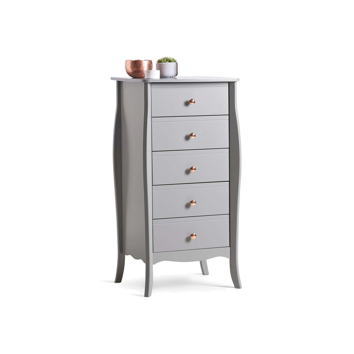 The ornate flourishes of vintage European design meet minimalistic, utility-focused craftsmanship in this sleek and stylish narrow storage unit. With a cool grey finish, gentle framework contouring and charming rose gold handles, these drawers represent a stylish confluence of classical flair and contemporary functionality. With five spacious drawers arranged in a column, this chest offers a huge amount of storage, without taking up a lot of precious floor space. Better still, each drawer is individually mounted on a set of smooth-gliding metal runners, giving you easy access to your belongings. Quality is just as important as appearance, which is why this furniture is manufactured with care using robust, high-grade materials. From the MDF wood frame to the stainless steel handles, every element of this stylish storage unit is made to stand the test of time."
