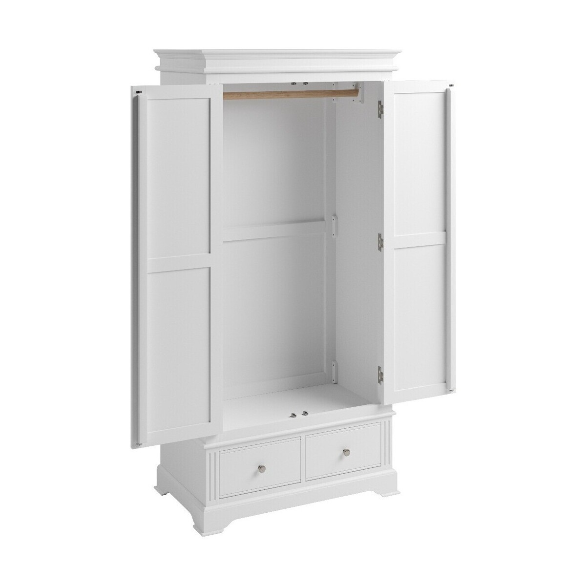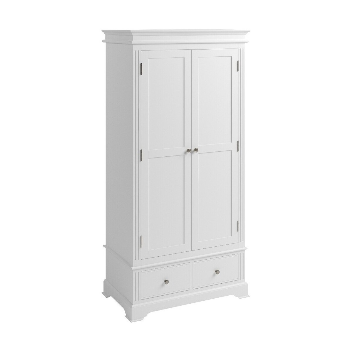 Featuring a classic design to suit any interior, the Grace White 2 Door Wardrobe is stylish and durable. Crafted from sturdy wood, the white painted wardrobe offers full hanging space for your clothes and features a removable solid wood hanging rail. The white wardrobe is complete with 2 handy lower drawers for additional storage. Sturdy and stylish white painted wardrobeDurableframe. Offers full hanging space for your clothes. Sculpted cornices and linear detail for a classic look to suit any home. Removable solid wood hanging rail2 handy deep drawers on wooden guides for additional storage Pewter effect knobs complete the look