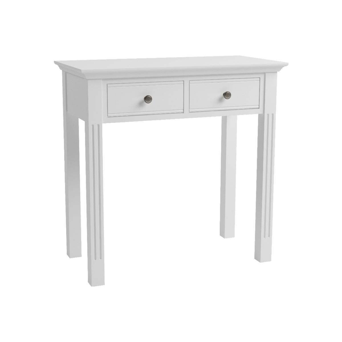 An elegant addition to your bedroom, the Grace White Dressing Table features a minimalist design to suit any home. Featuring a durable wood frame and sturdy legs, the white painted dressing table offers handy storage in the form of 2 drawers on wooden guides and is complete with pewter effect knobs. Stylish dressing table with timeless design. Durable wood frame. White painted finish for a classic look to suit any home Sculpted cornices and sturdy legs with elegant detailing2 handy drawers offer convenient storage Pewter effect knobs complete the style Complement the dressing table with the matching stool and mirror