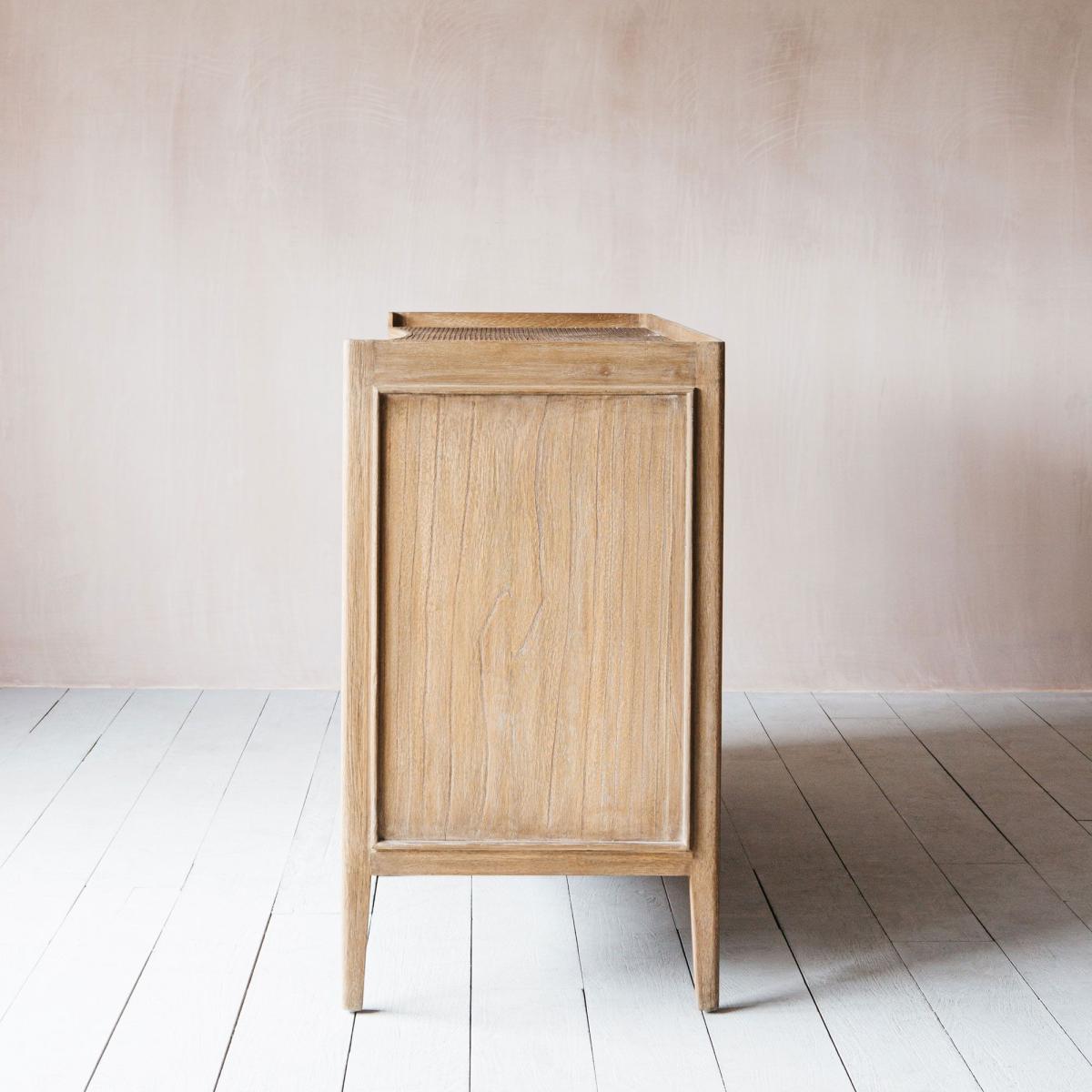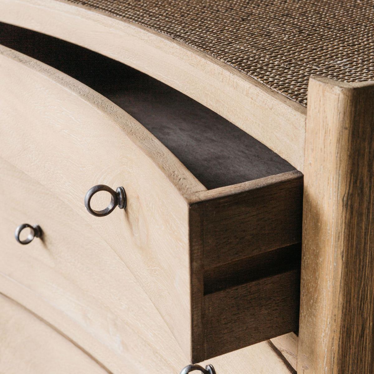 A classic country design with fine tapered legs crafted from bayur wood and a wicker rattan top. Featuring six generously sized drawers finished with black handles to store your best linens or your finest cashmere.