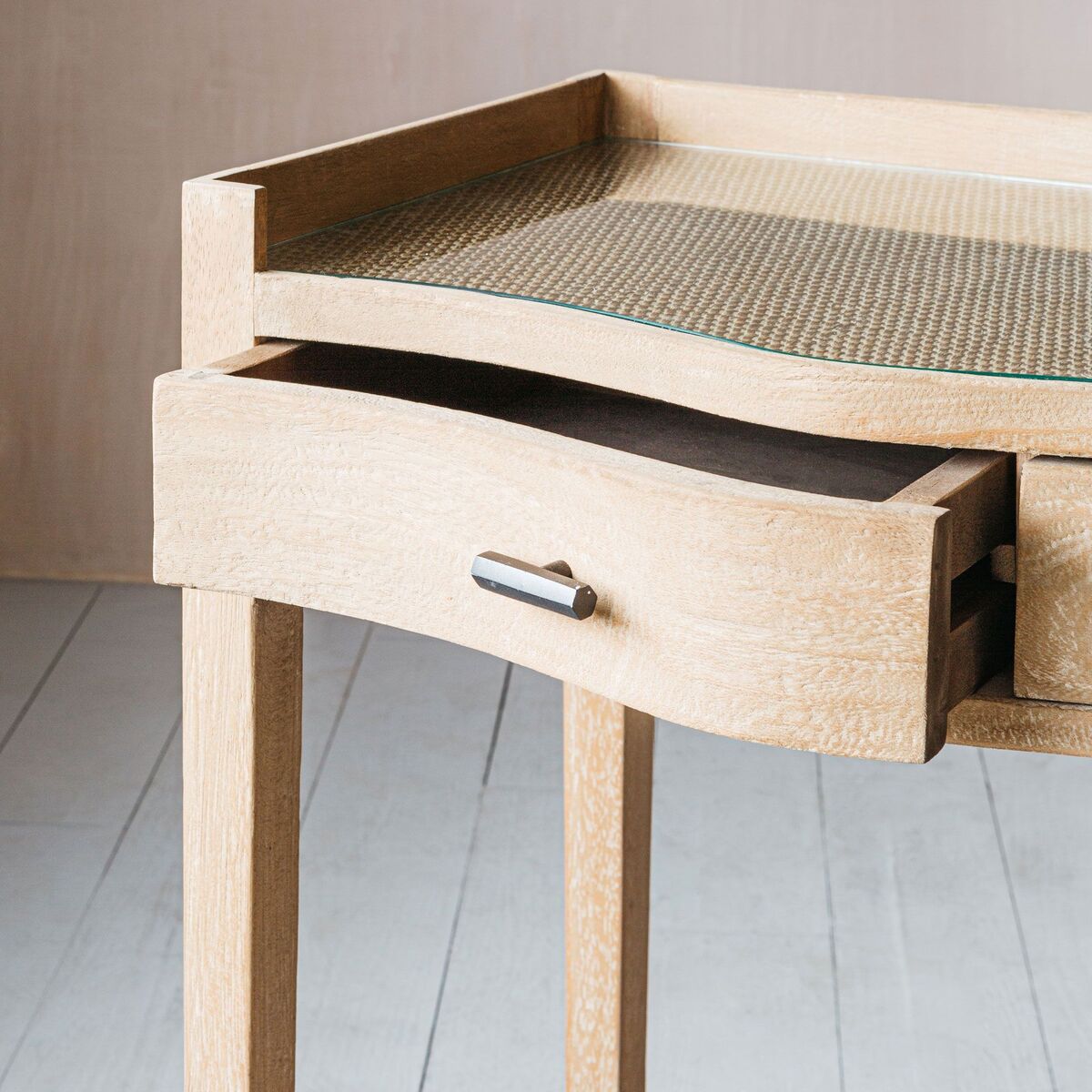 A classic country design with a glass covered wicker top, tapered legs and a crossover base crafted from bayur wood native to India. Style in the hallway with a large vase of flowers to greet you at the end of the day and store your keys and accessories within the three generous drawers finished with black handles.
