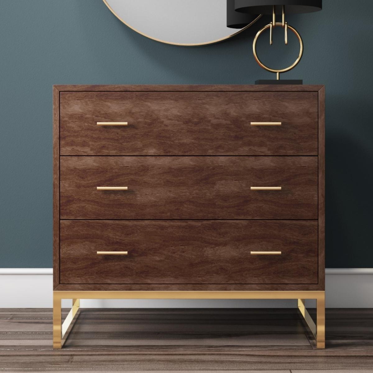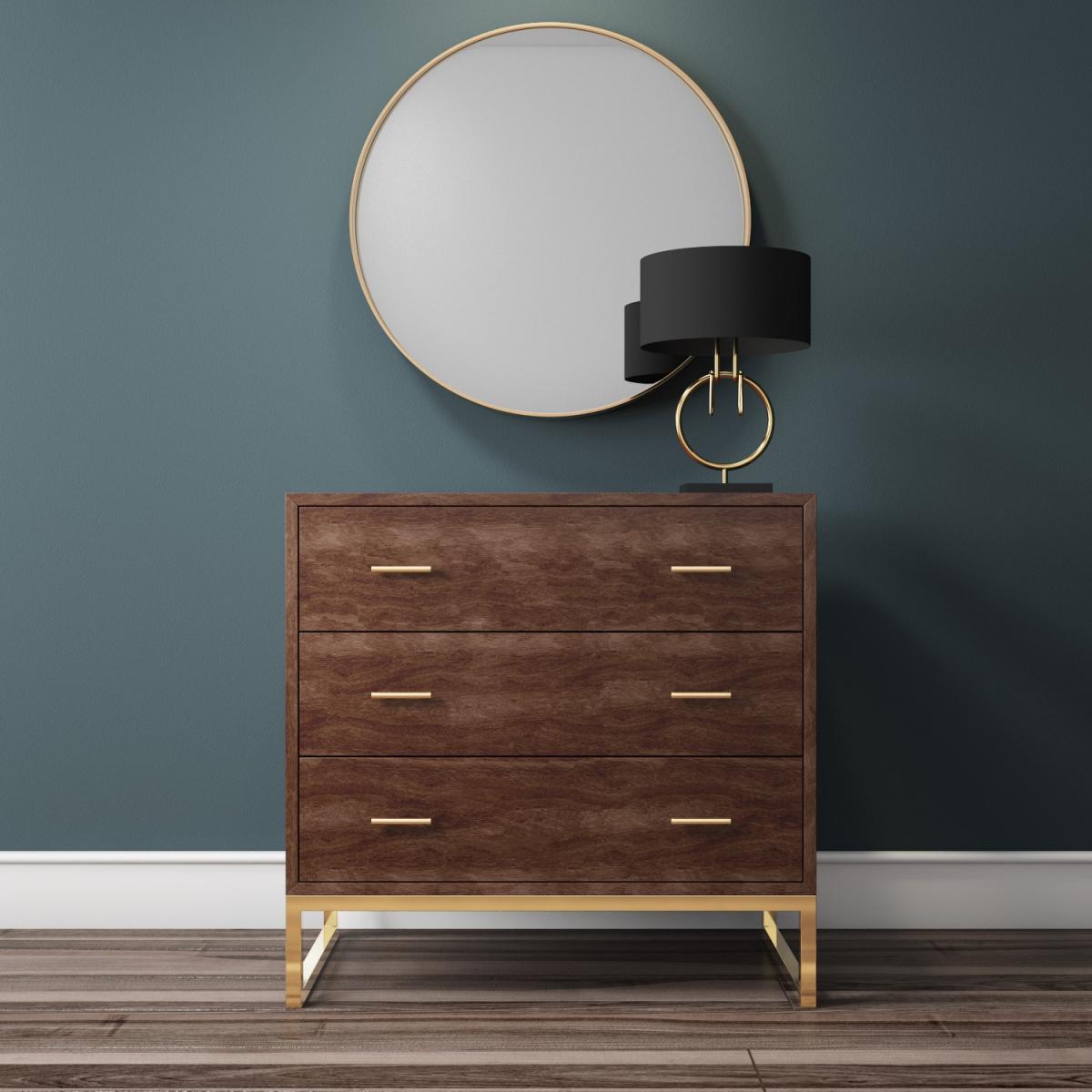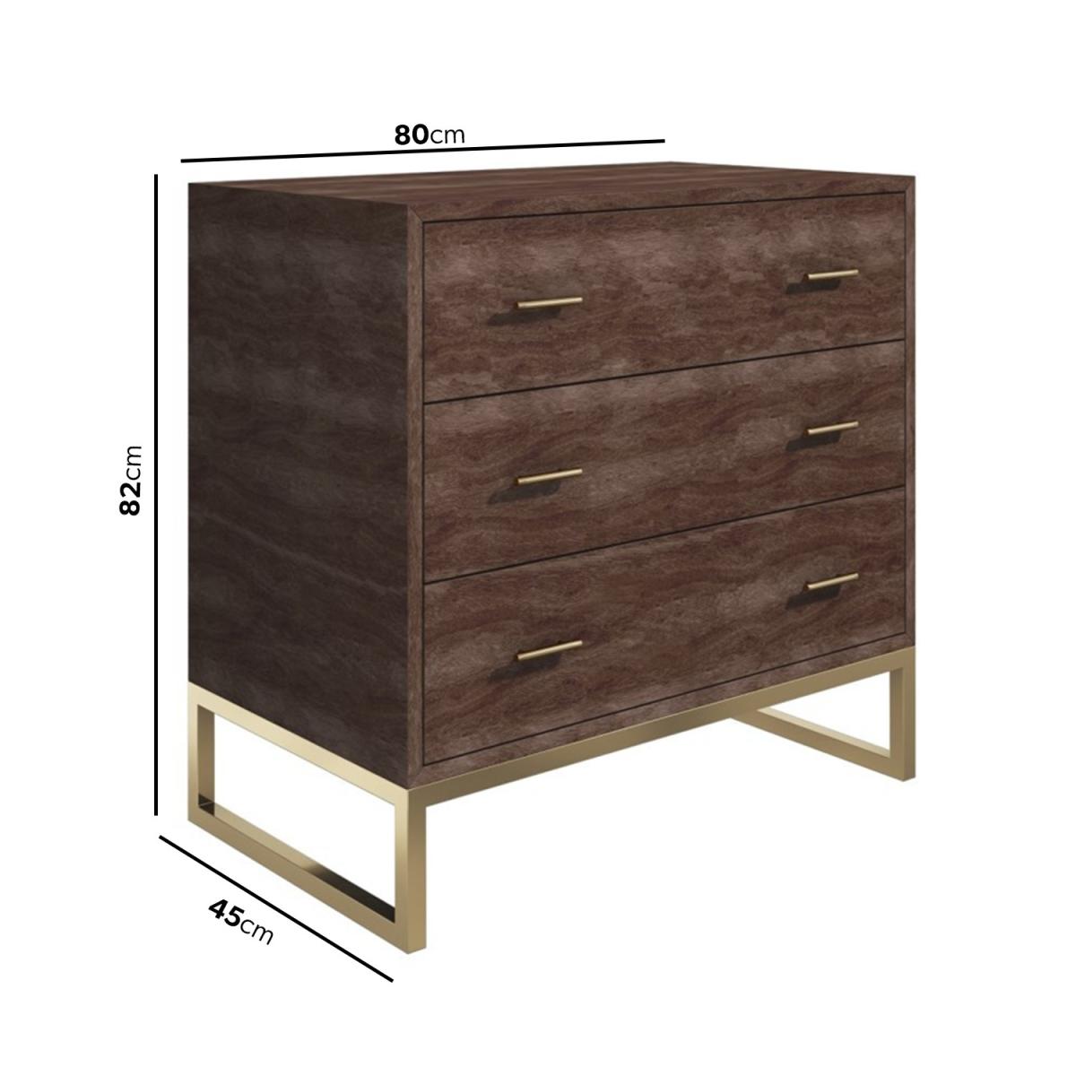 What stands out Expertly handcrafted by skilled artisans each piece offers its own charm and characteristics to ensure each piece is truly unique and individual. Contemporary in design adding an industrial twist to a more traditional piece. The walnut finish and gold details help produce a warming piece overall3 spacious drawers make it ideal for sorting and storing your clothes. Its solid design means you can be confident it'll withstand the test of time. Individually handmade every piece has a unique element and personal touch. Delivered fully assembled you can put your feet up and enjoy your drawers right away. Created using 100% vegan friendly materials The details. Spacious fantastic to look at and handcrafted especially for you this Aubrey chest of drawers is the piece you've been missing in your bedroom. Putting a classic twist on the industrial trend this set of drawers oozes quality and style and suits both modern and more traditional styles. The drawers are really spacious so there's plenty of room to store your clothes neatly! And with such a spacious top there's plenty of room for a mirror and all your essentials doubling it up as the perfect dressing table. Finished in a walnut effect this chest offers a feeling of warmth to your room while the contrasting gold base and handles add a sense of grandeur. Fully assembled you can enjoy this piece as soon as you get it home. Its solid design ensures it'll withstand the test of time and look fantastic for years to come. Essential info. Dimensions. H 82 x W 80 x D 45 cm Drawer dimensions. H 20 x W 76 x D 41 cm (inside depth 15cm) Material. Solid mango wood with iron base Finish. Walnut and gold PU Drawers. 3 Assembly required. No More info Handmade piece for personal touch. Delivered fully assembled. Matching items available in the Aubrey range. Made from sustainably sourced wood materials.