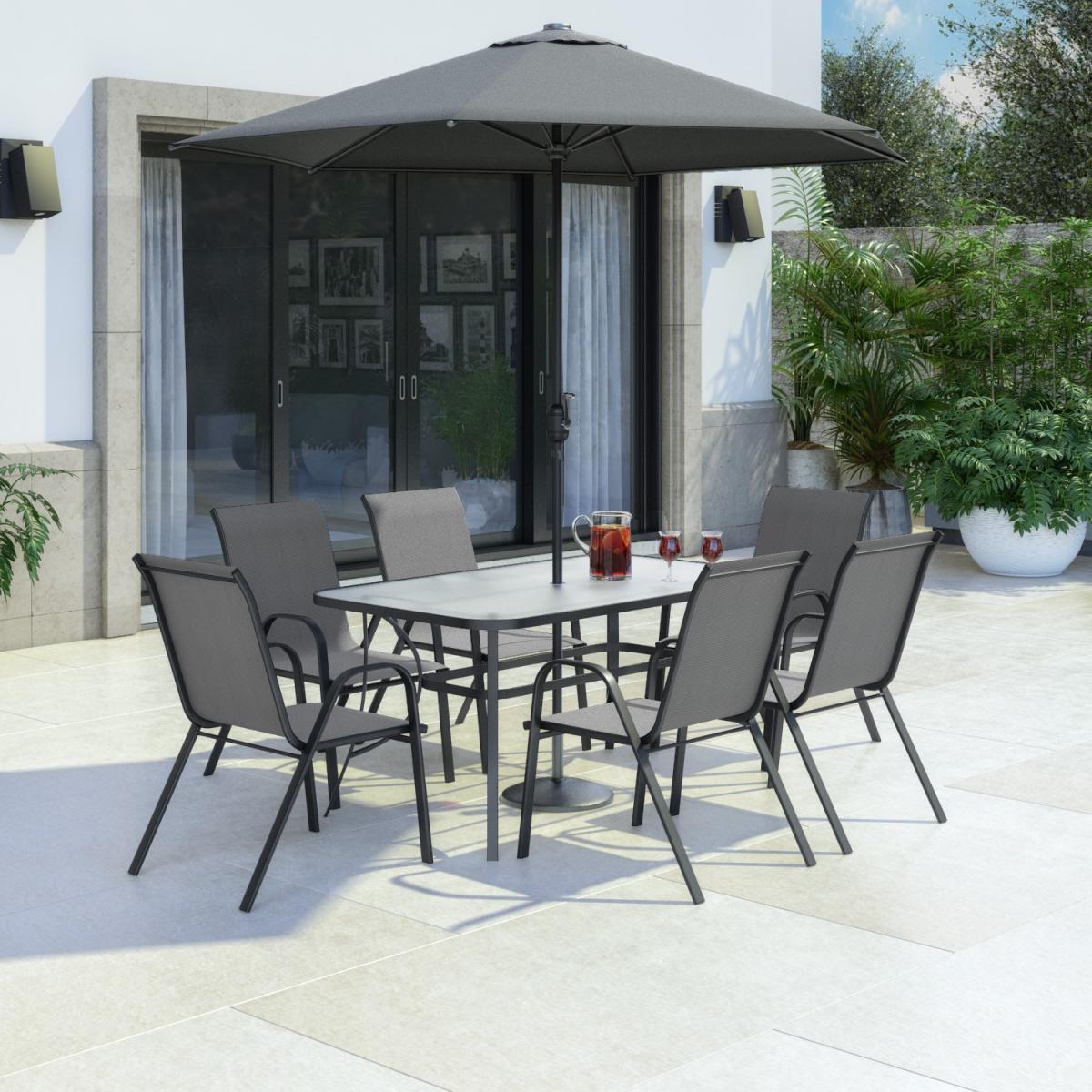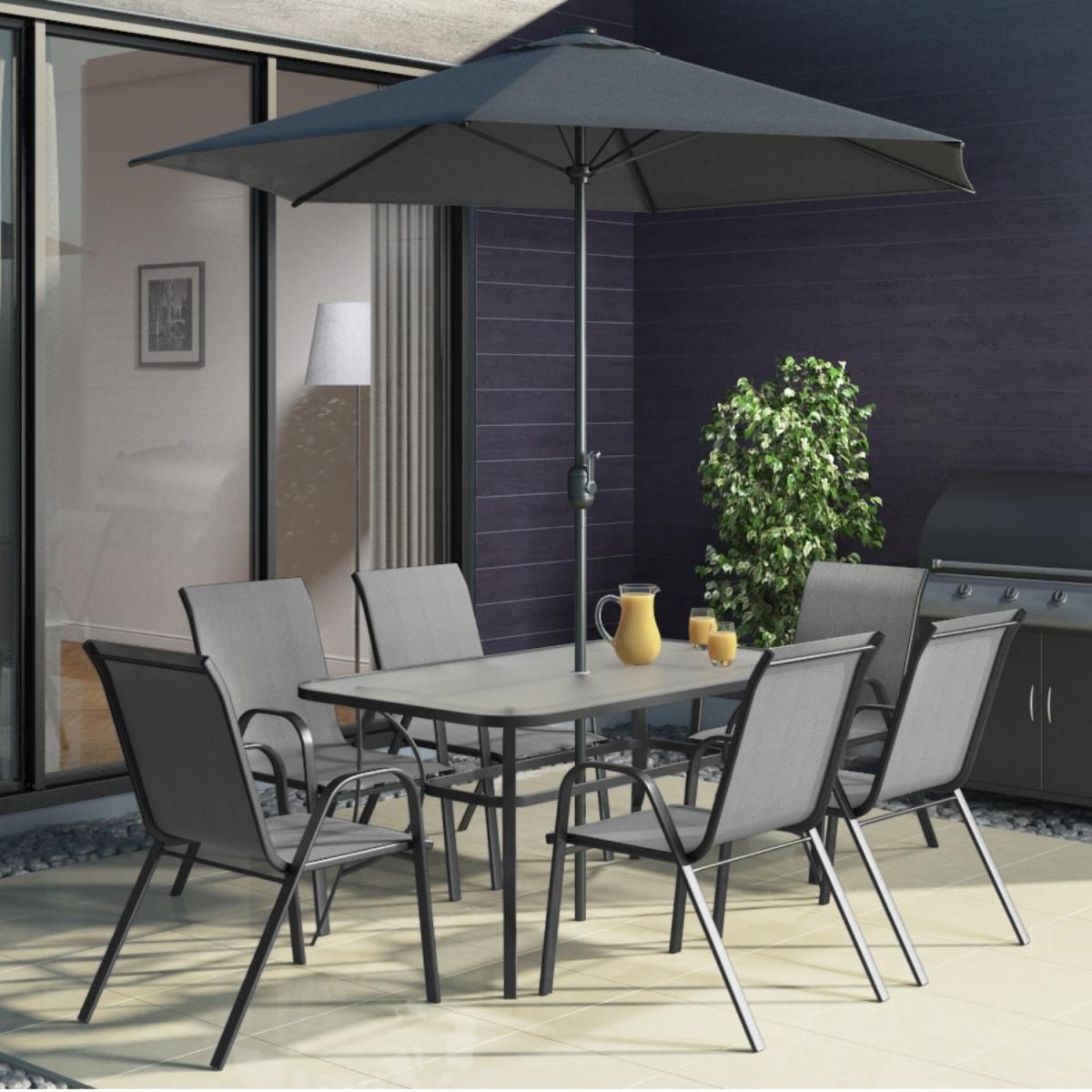 Dine out in style with this attractive outdoor six-seater garden furniture set. This family sized set consists of a 150cm wide rectangle table with tempered safety glass top, accompanied by six stacking chairs finished in a charcoal finish that looks wonderful in any setting. It even includes a large parasol to protect you from the sun or the odd shower. The table and chairs are manufactured from a steel frame that's both strong and fully weather proof to use outdoor in the unpredictable British weather. Plus, the chairs use a textilene fabric that's super comfortable to sit on and easy to clean - simply wipe down and you're ready to enjoy a spot of al fresco dining! And, when not in use, the chairs can be stacked on top of each other and easily stored away.
