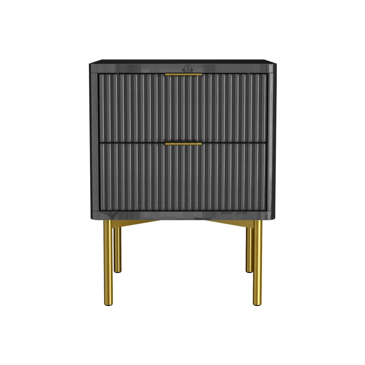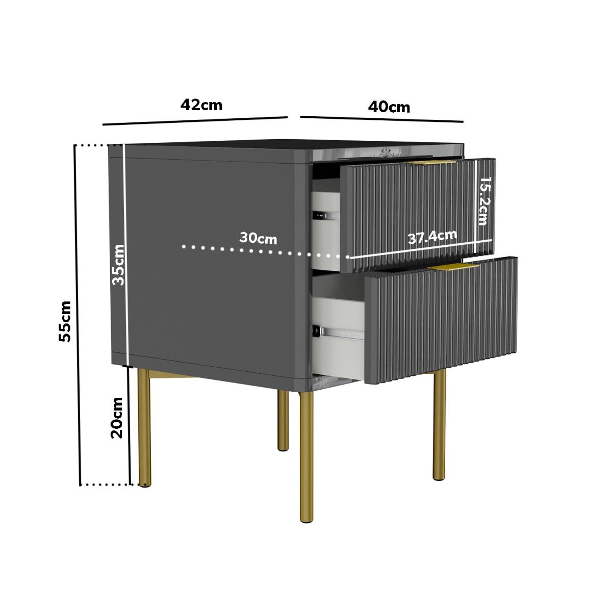 Grey high gloss finish with brushed gold accents Features contemporary ridged detail Two drawers provide ample storage for those night-time essentials Grey and gold colours add a touch of glamour to your bedroom Valencia range of furniture is also available in white Easy to assemble Need to know Number of drawers: 2 Colour: High gloss grey and gold Cabinet finish: Lacquered Leg finish: Gold polished stainless steel Material: MDF and metal Weight: 15kg Assembly required: Yes