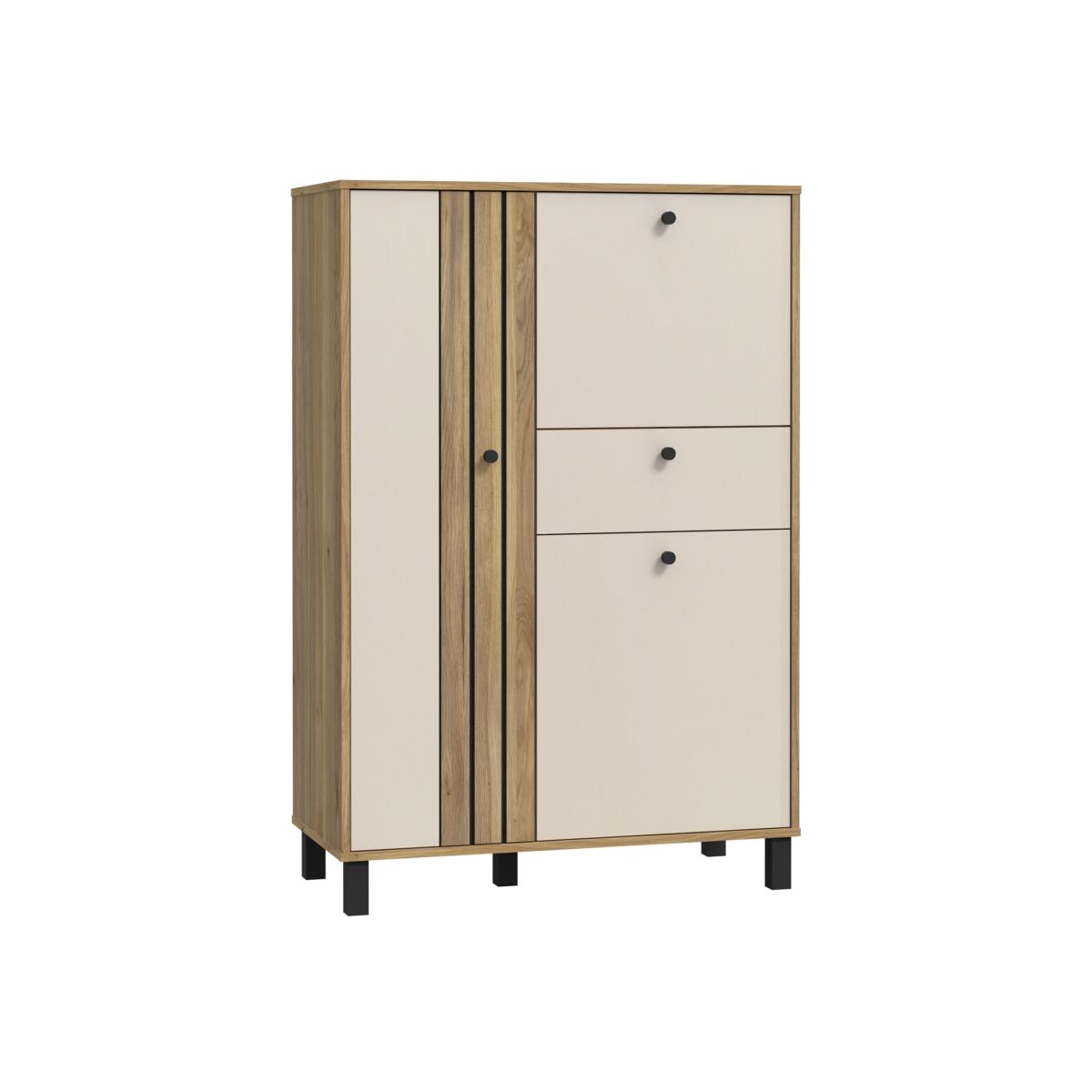 Infuse your space with industrial charm using the Grafton Tall Cabinet. Offering ample storage space, this cabinet features two pull doors, a flip door and a drawer to keep all your essentials in place. Ideal for storing dinnerware, glassware, books and papers, it makes a versatile piece of furniture that can be used in any room. Its sleek and stylish oak-cream finish complements an array of interior styles, while the sturdy laminated chipboard construction ensures it's built to last. Part of the Grafton collection, you can pair it with matching furniture items to create a coordinated indoor space.
