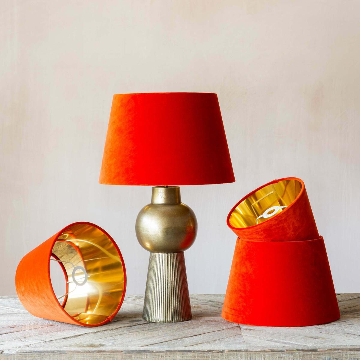 An opulent and luxurious collection of light shades of vibrant carnelian orange velvet complimented by a shimmering gold metallic inner and a tapered retro shape. 10" (AXB1029): H19 x Diameter 25. 5cm. 12" (AXB1030): H22 x Diameter 30cm. 14" (AXB1031): H24 x Diameter 36cm. 16" (AXB1032): H27 x Diameter 40cm. Made of cotton velvet and wire. Shiny gold inner. These products are handmade so the shape and finish may vary and seamlines may be visible and the shade of the velvet may vary dependant on lighting. Available in a variety of sizes, our shades are suitable to use with lamps and ceiling lights. Please note, when paired with a ceiling light the shade may sit slightly lower due to the position of the fitting, reducing the amount of light that's emitted.