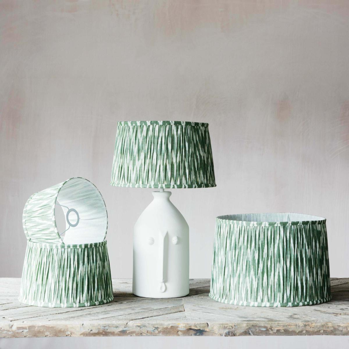 A collection of artisan-made patterned lampshades in a rich olive green colour with flecks of cream throughout. Each one is handmade on an iron frame using the traditional Ikat dyeing techniques that originated in Indonesia to create an entirely unique print. Read our Lampshade Guide to find the right size. 10" (AUQ1026): H16 x Diameter 25cm. 12" (AUQ1025): H19 x Diameter 30cm. 14" (AUQ1024): H21 x Diameter 35cm. 16" (AUQ1023): H26 x Diameter 40cm. Made of fabric and iron. Features a tapered shape. These products are handmade and hand-dyed so the shape, pattern and finish may vary and seamlines may be visible. Available in a variety of sizes, our shades are suitable to use with lamps and ceiling lights. Please note, when paired with a ceiling light the shade may sit slightly lower due to the position of the fitting, reducing the amount of light that's emitted. Read the Lampshade Guide.
