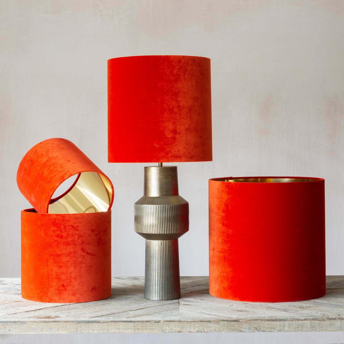 Bursting with colour, these tall and opulent light shades are handmade from carnelian orange velvet with a gold metallic inner and a tall silhouette. 10" (AXB1017): H25 x Diameter 25. 5cm. 12" (AXB1018): H25 x Diameter 30. 5cm. 14" (AXB1019): H25 x Diameter 36cm. 16" (AXB1020): H25 x Diameter 41cm. Made of cotton velvet and wire. Shiny gold inner. These products are handmade so the shape and finish may vary and seamlines may be visible and the shade of the velvet may vary dependant on lighting. Available in a variety of sizes, our shades are suitable to use with lamps and ceiling lights. Please note, when paired with a ceiling light the shade may sit slightly lower due to the position of the fitting, reducing the amount of light that's emitted.