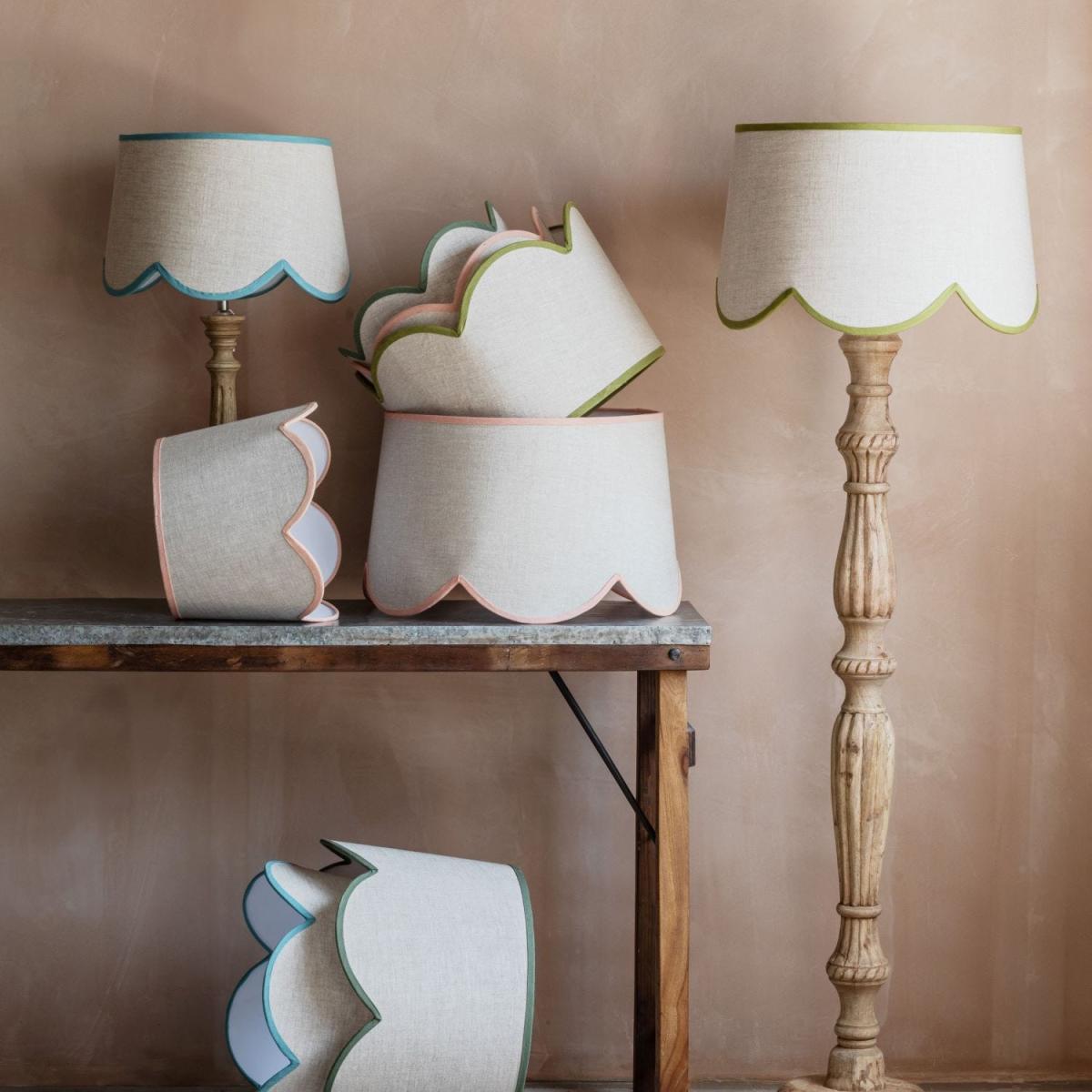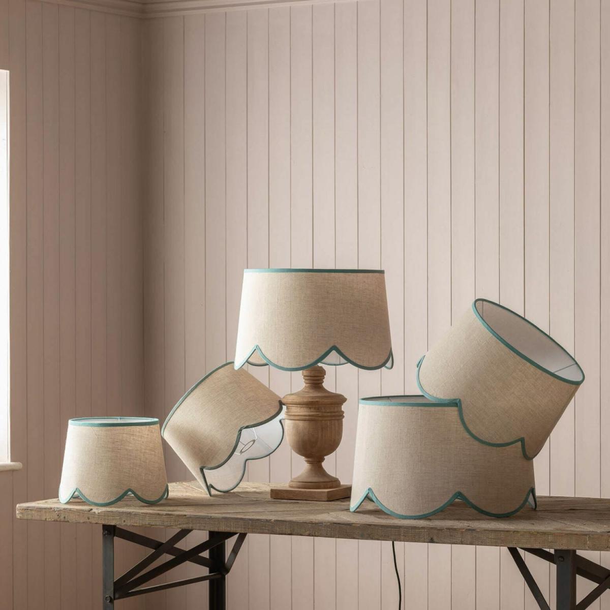 These French-inspired drum Lamp Shades are handmade from earthy, natural linen and finished with a turquoise trim to highlight the scalloped details. The weave within the linen brings a beautiful texture to the shades which is enhanced when lit. Available in four sizes to perfectly compliment any