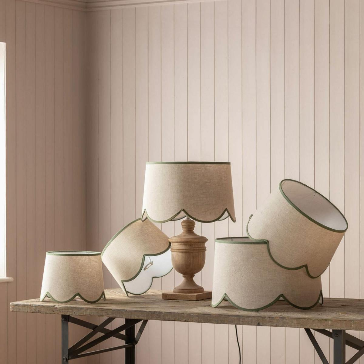 These French-inspired drum Lamp Shades are handmade from earthy, natural linen and finished with a woodland green trim to highlight the scalloped details. The weave within the linen brings a beautiful texture to the shades which is enhanced when lit. Available in four sizes to perfectly compliment any