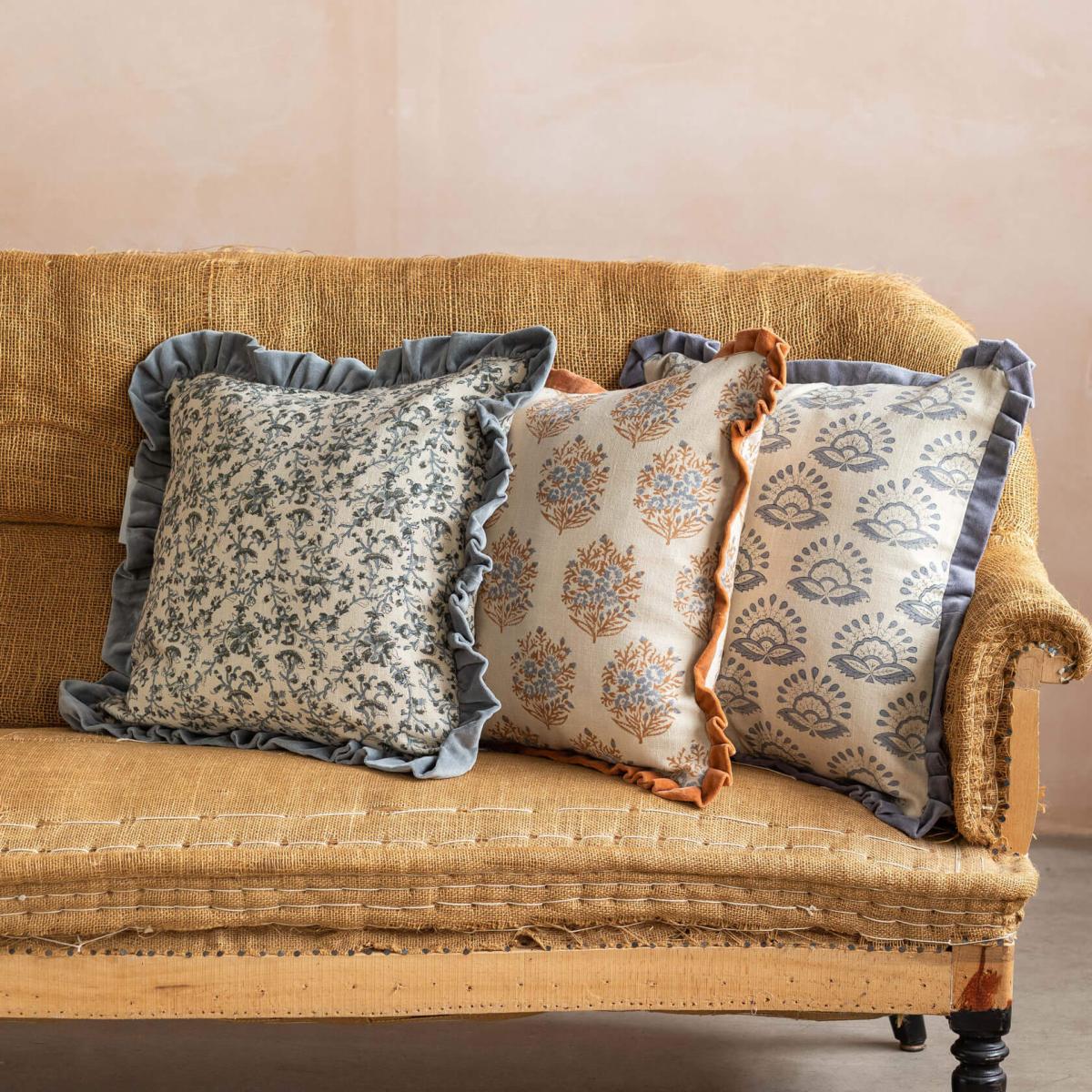 Expertly hand-block printed using traditional wooden blocks and soft cotton fabric, these square cushions feature delicate floral motifs and are finished with a coordinating velvet trim. Complete with a feather-filled inner, they make an elegant finishing touch for a sofa or armchair.