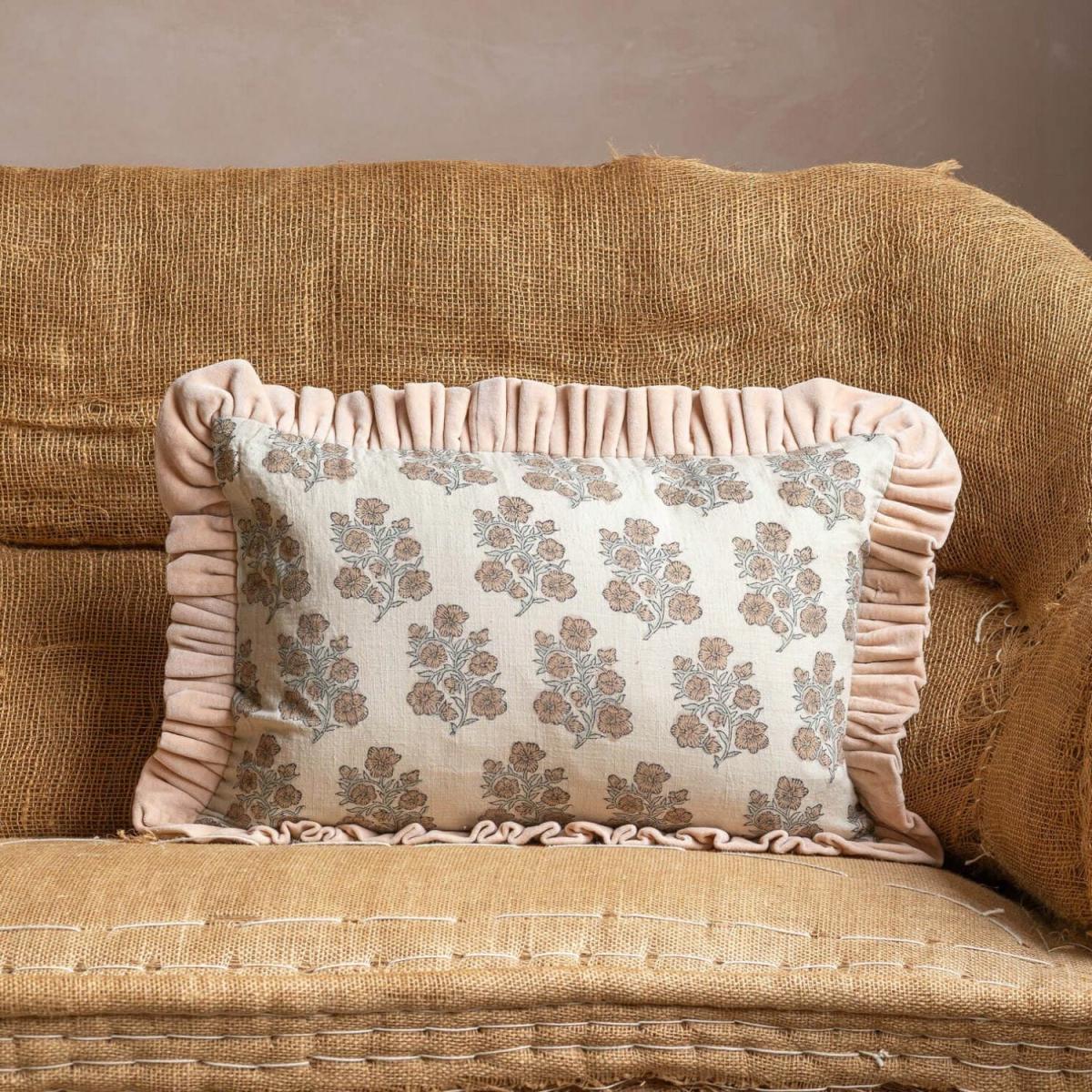 Traditional block printing techniques have been used to create the antiqued floral patterns on these Small Rectangular Cotton Cushions. Each feather-filled cushion is made in Jaipur, India, and finished with a velvet frilled border.