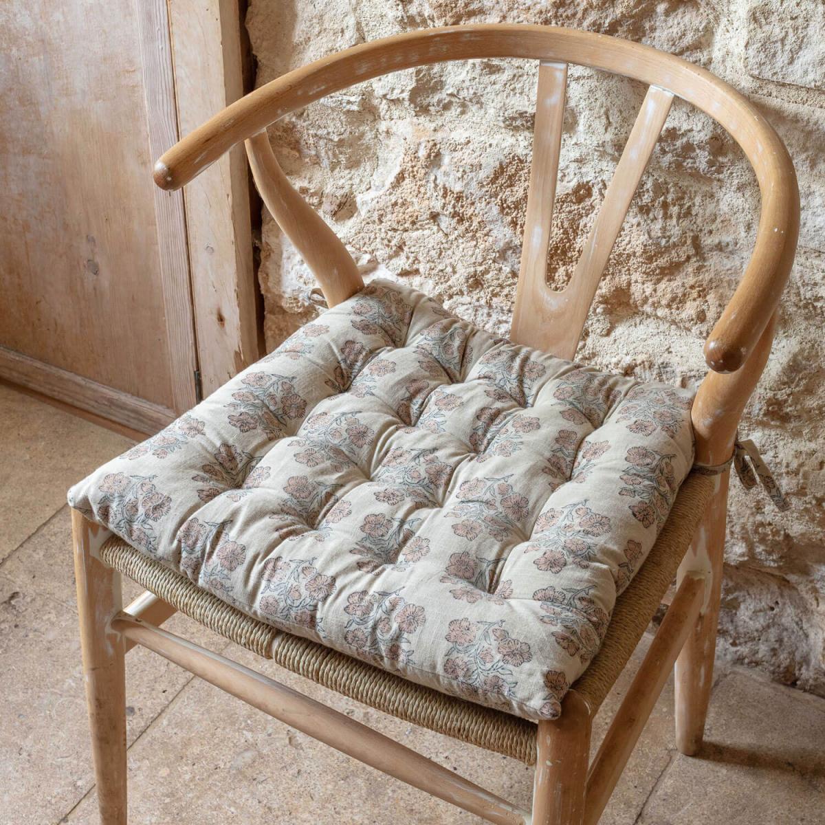 Traditional block printing techniques are used to create the soft, antiqued floral patterns on these Cotton Seat Pads. Complete with coordinating ties, ready to attach to your dining chairs, these seat pads will look great mix and matched around your table.
