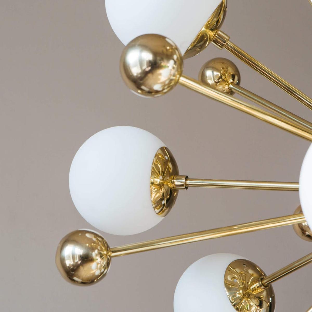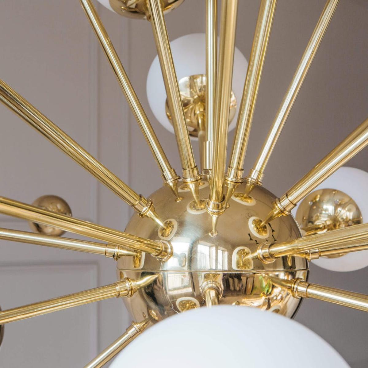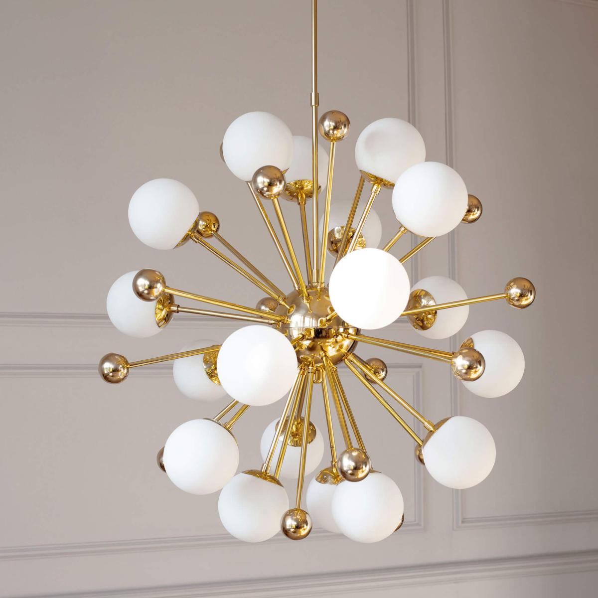 A space age inspired pendant with a burst of gold rods and opal glass globes mounted on a brass frame and a tapered ceiling rose. A spectacular addition to your home, this ceiling light introduces mid-century style. L125 x Diameter 76cm. Requires 18 x E14 Max 14W bulb (not included).Globes: Diameter 15cm. Ceiling rose: Diameter 12. 7cm. Minimum Drop: L18cm | Maximum Drop: L38cm. Weight: 9kg. Made of polished brass. We recommend consulting a qualified electrician for installation guidance.