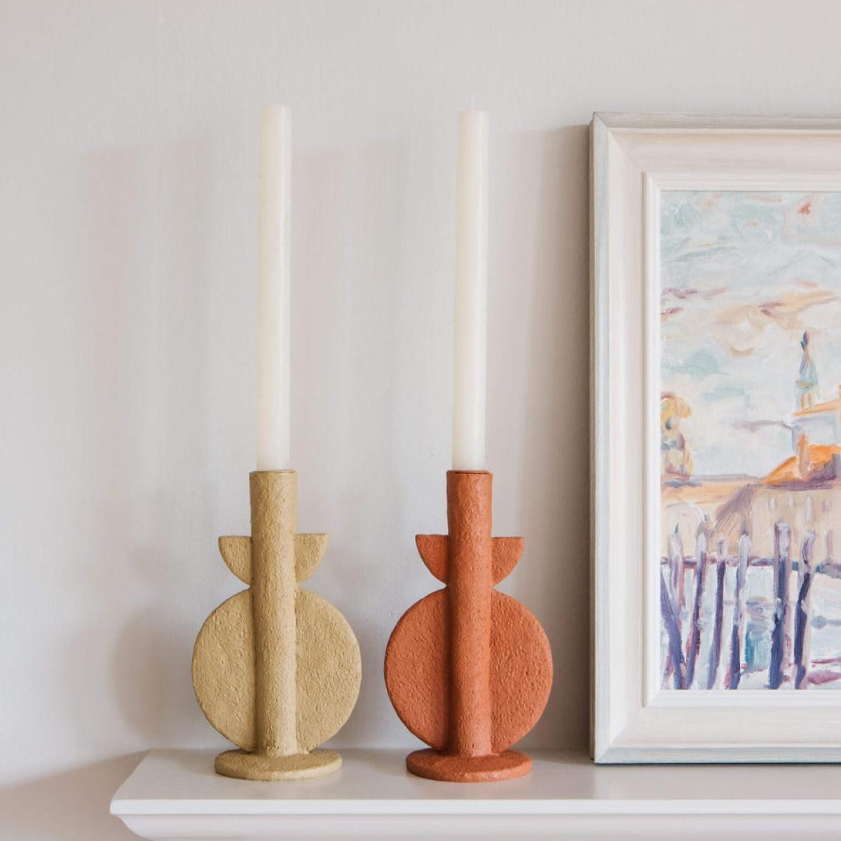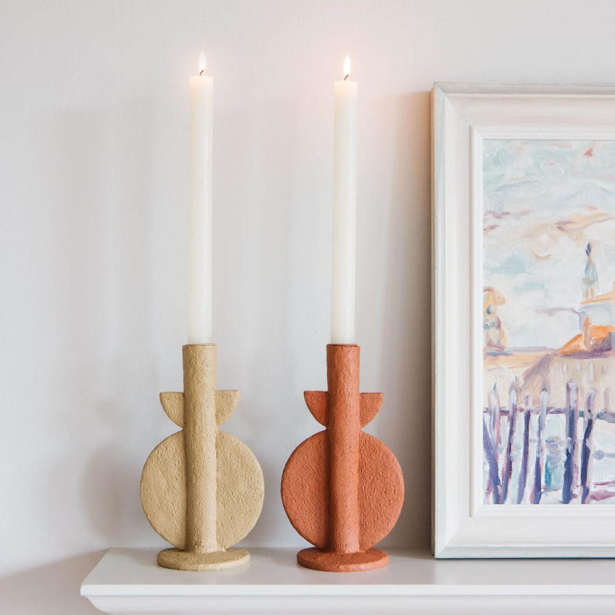 A sculptural candle holder with a geometric bubble shape and a rough textured finish in a terracotta hue. Top with dinner candles in rustic hues.