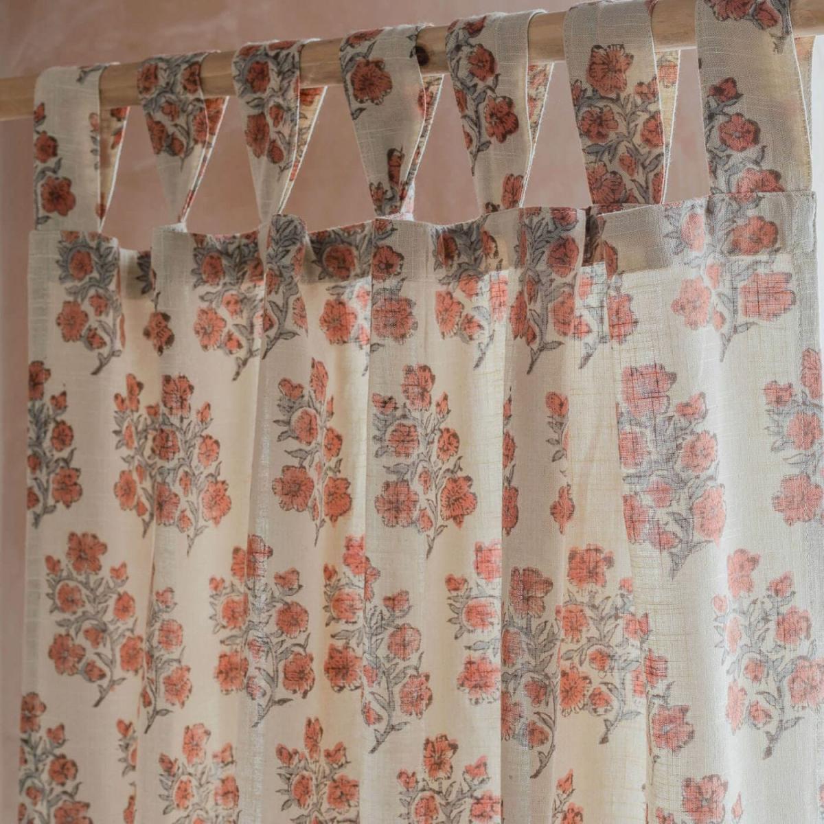 Traditional printing techniques have been used to create the antiqued floral patterns in these curtains. Each flowing curtain has been made in Jaipur from a light, cotton fabric, making them ideal for filtering out light or layering for a more dense coverage. Curtains are sold individually.