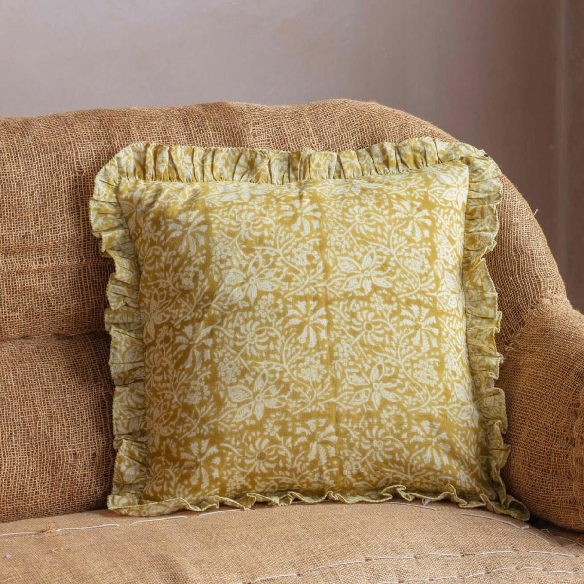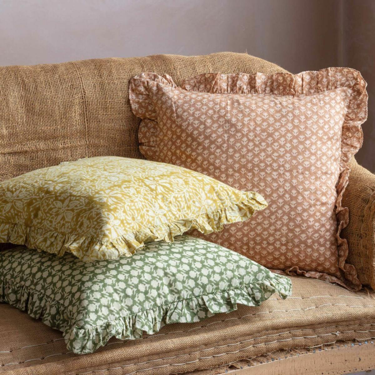 These square cushions have had their floral designs block printed using traditional techniques where the design is carved into a wooden block before the repeat pattern is printed by hand. Each cushion is filled with a feather inner and finished with a delicate matching frill edge.