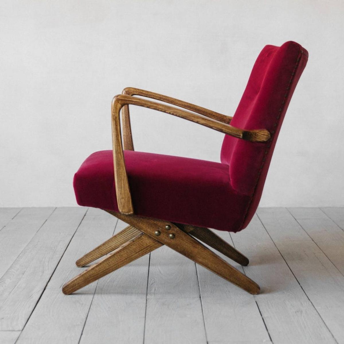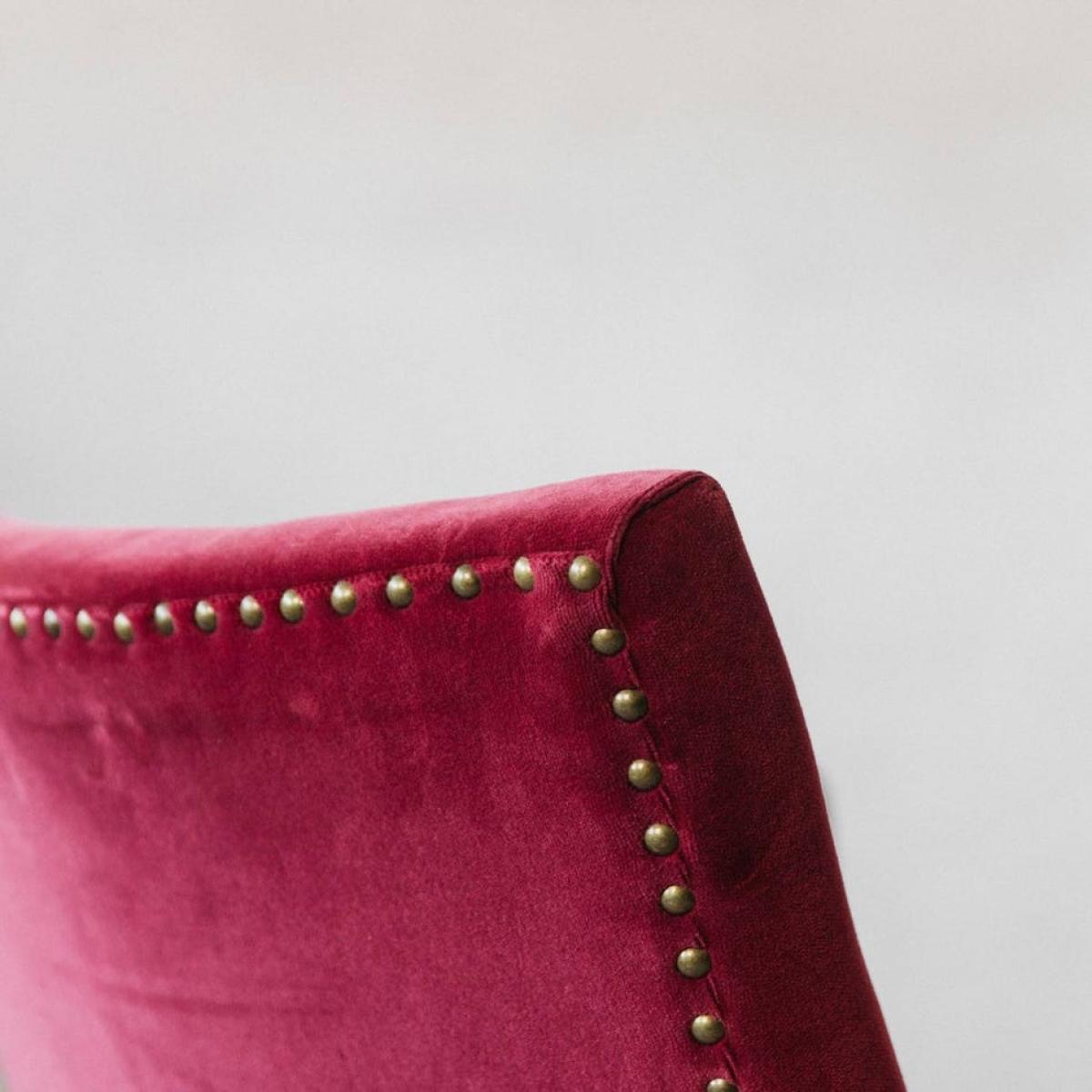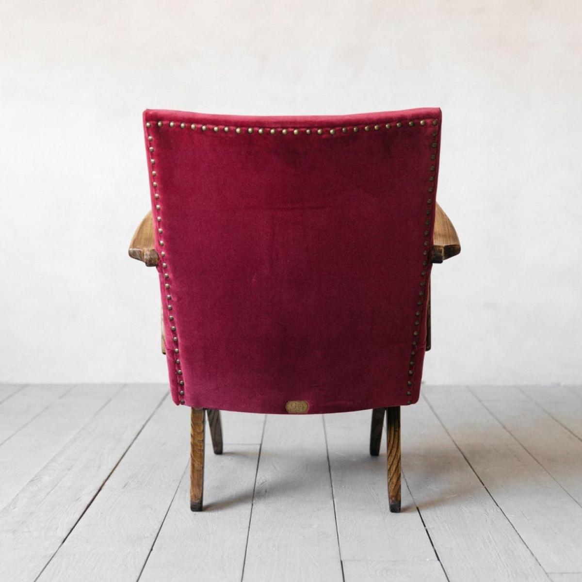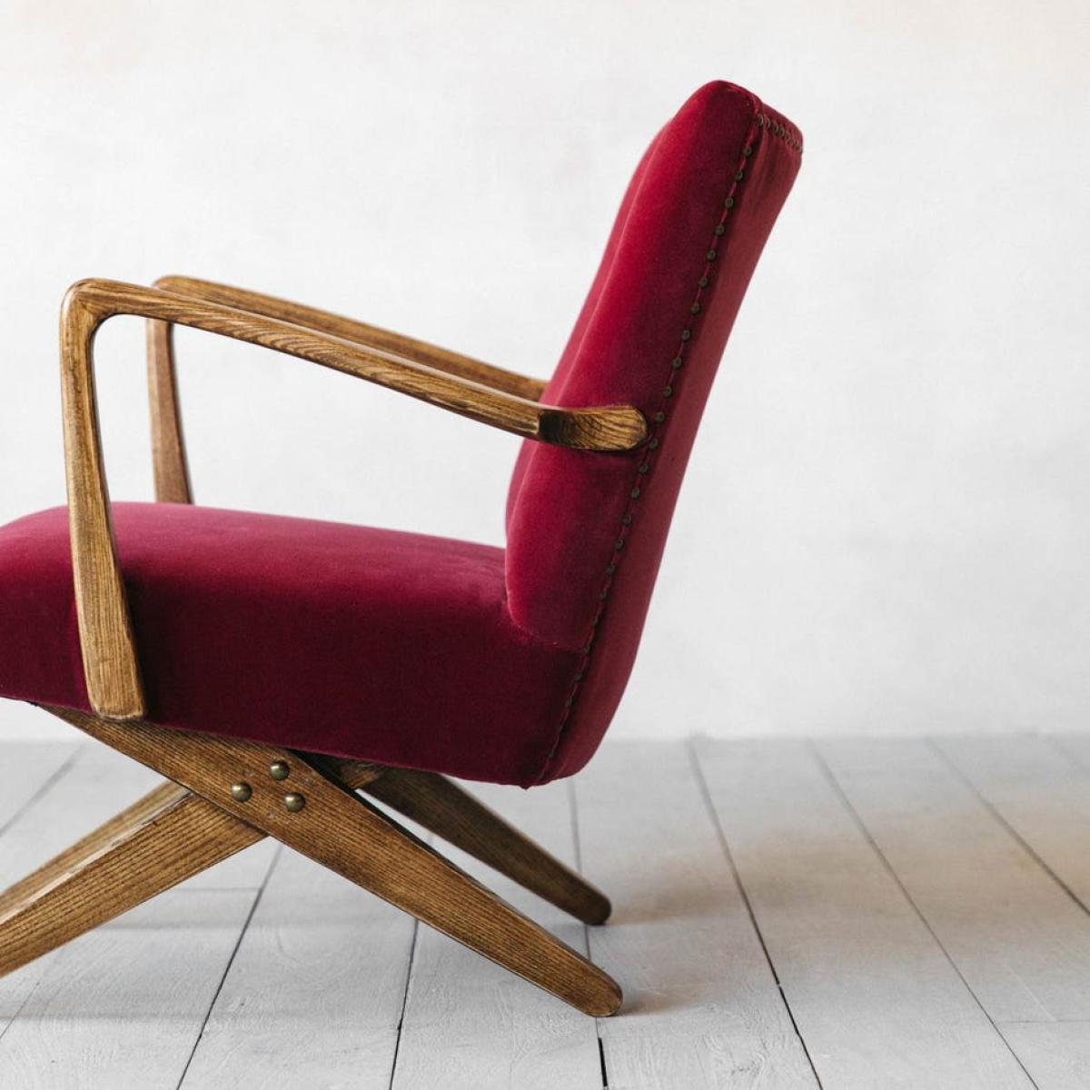 A mid-century style occasional chair, handcrafted from oak wood and upholstered in a rich raspberry velvet. Featuring sleek arms, cross-style legs and rivet detailing on the back, the Axel will make a luxurious addition to your interior.