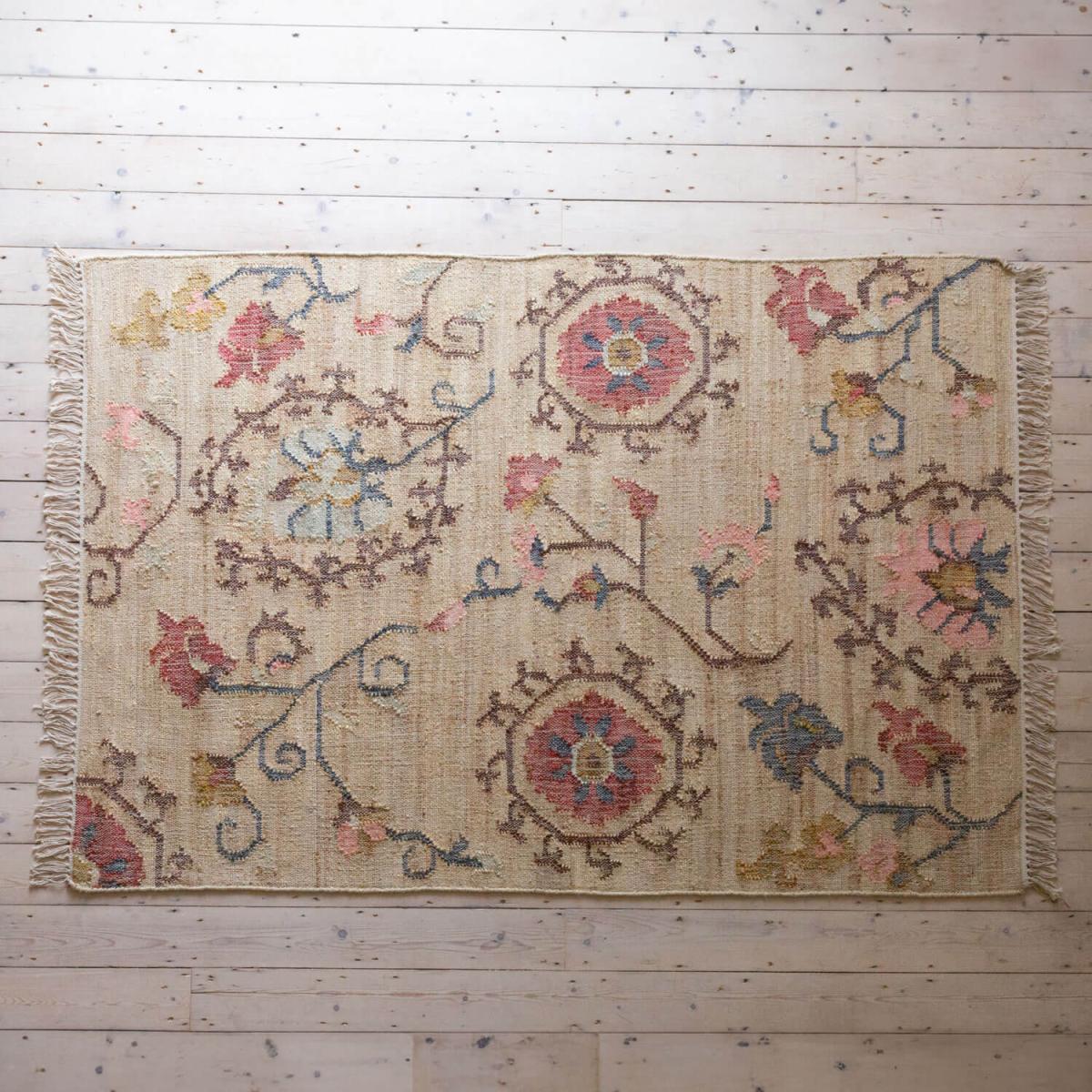 The Bayar rug collection is woven by hand from jute and cotton in the traditional kilim style to create an ornate floral design in light hues that will soften up your bedroom or sitting room. MQM1011 :L200 x W140cm. MQM1010 :L230 x W160cm. Handwoven from cotton. We recommend spot clean only.