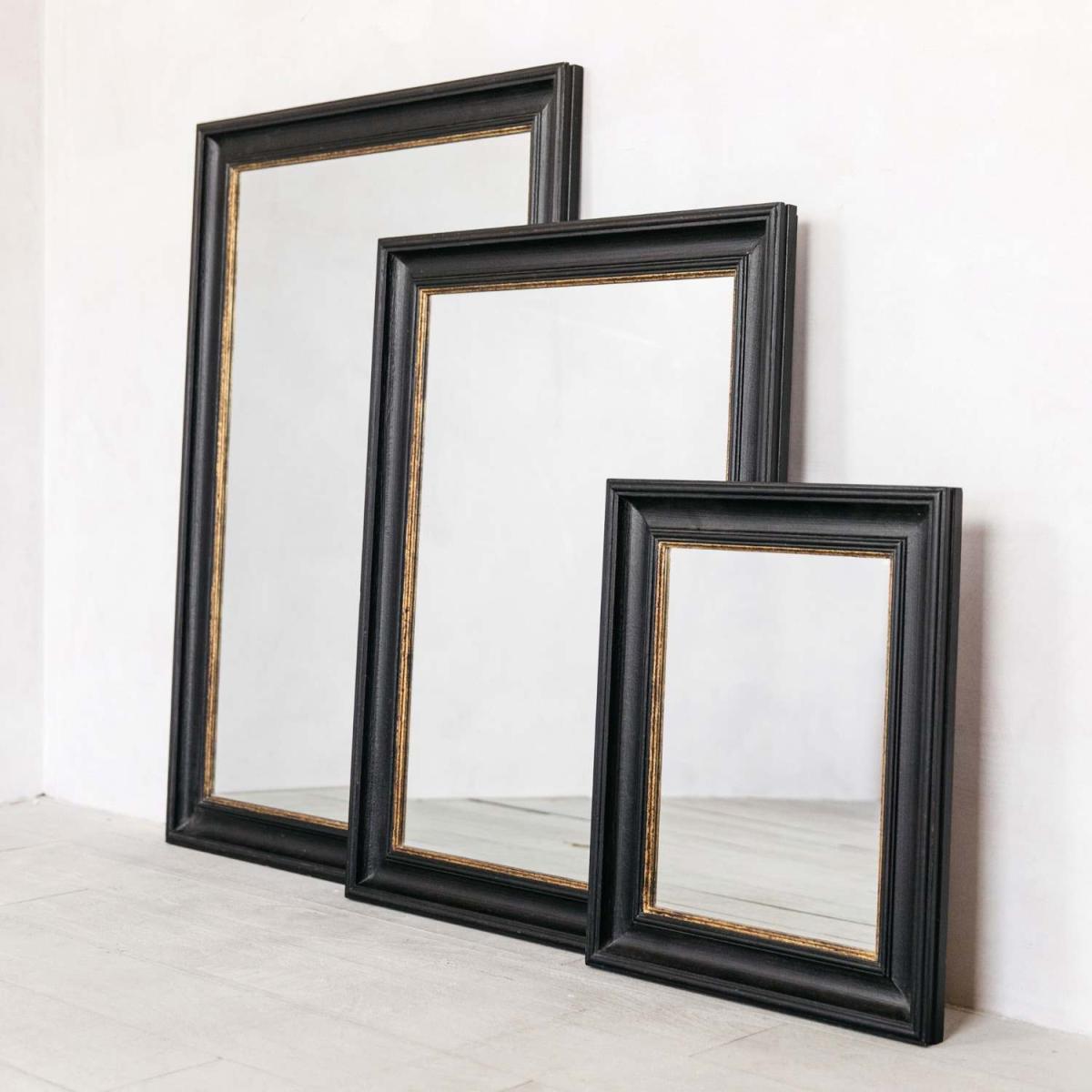 A collection of subtly distressed rectangular mirrors crafted from paulownia wood and finished in black with antiqued gold detailing on the inner frames. Available in three sizes, these mirrors will suit any interior space. Small (QCU1004): H54 x W44 x D3. 5cm. Medium (QCU1005): H84 x W64 x D3. 5cm. Large (QCU1006): H104 x W74 x D4cm. Small mirror: H40 x W30cm. Medium mirror: H69 x W49cm. Large mirror: H88 x W59cm. Made of paulownia wood and glass. Can be hung both portrait or landscape. Sold individually.