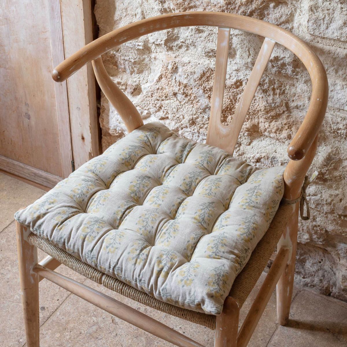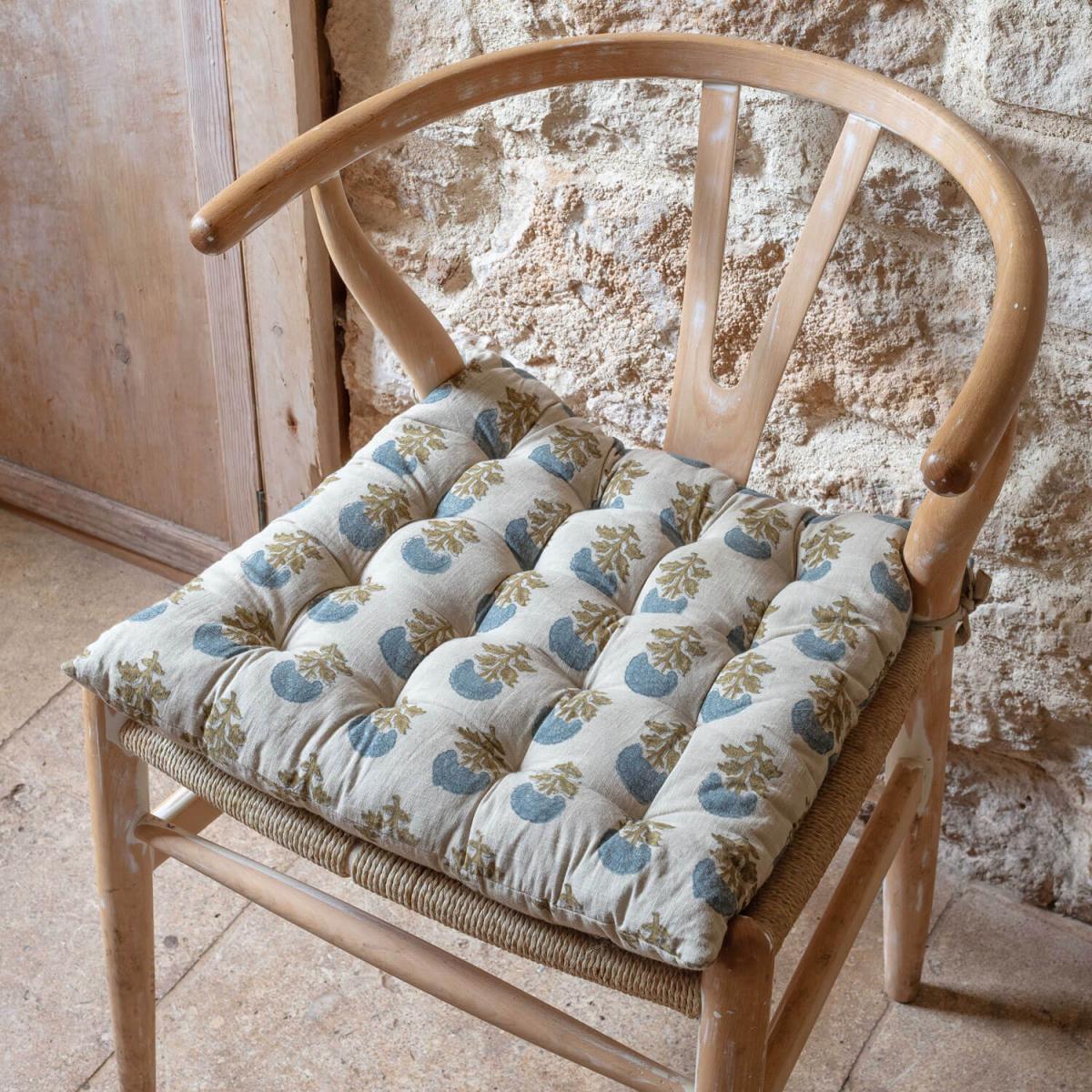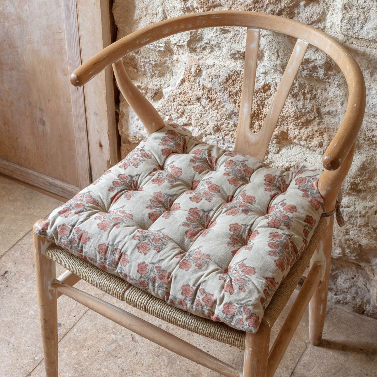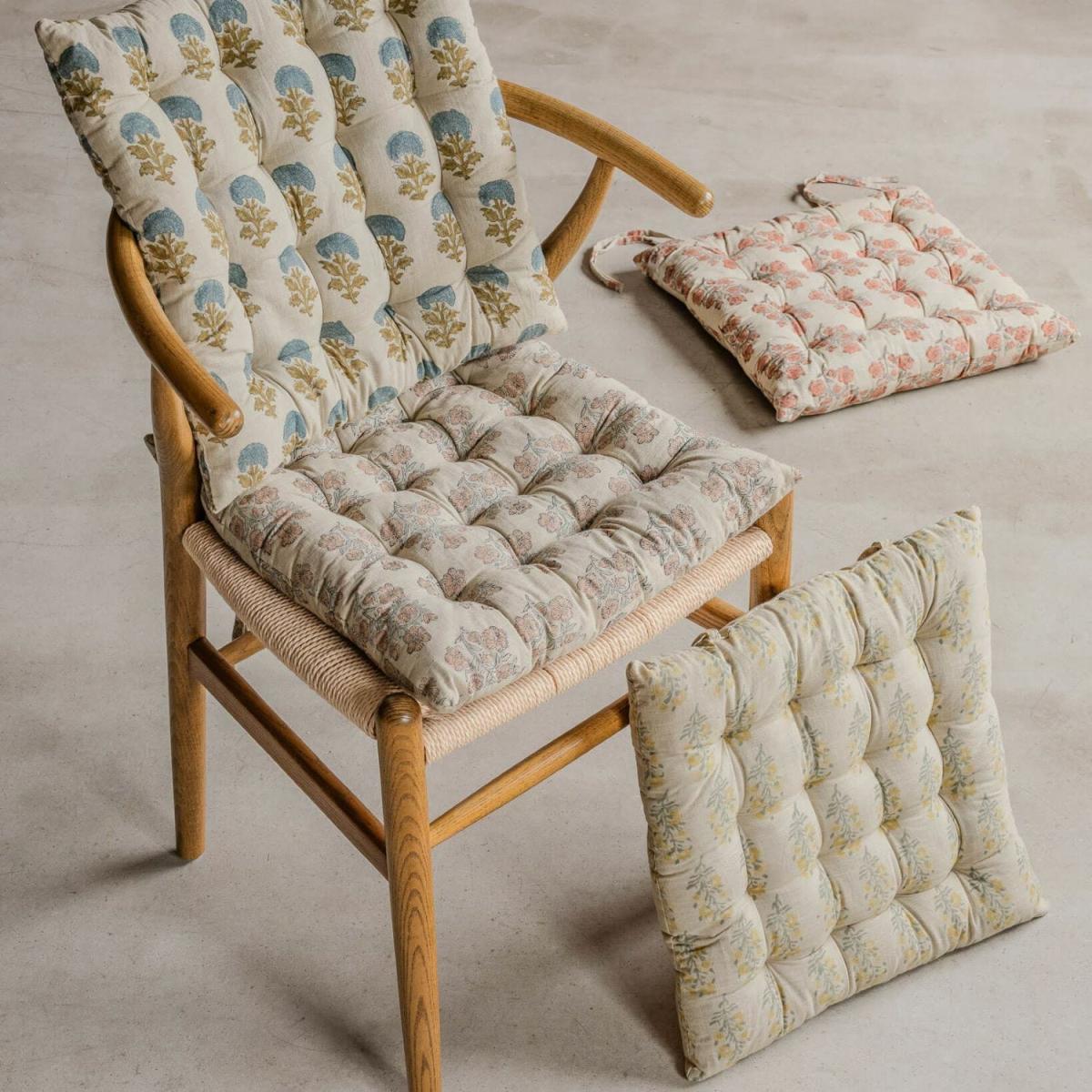 Traditional block printing techniques are used to create the soft, antiqued floral patterns on these Cotton Seat Pads. Complete with coordinating ties, ready to attach to your dining chairs, these seat pads will look great mix and matched around your table.