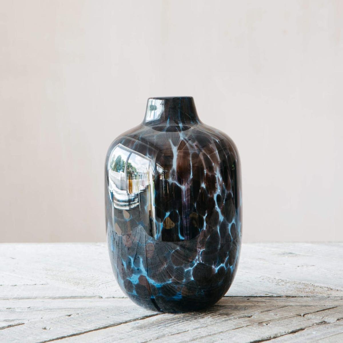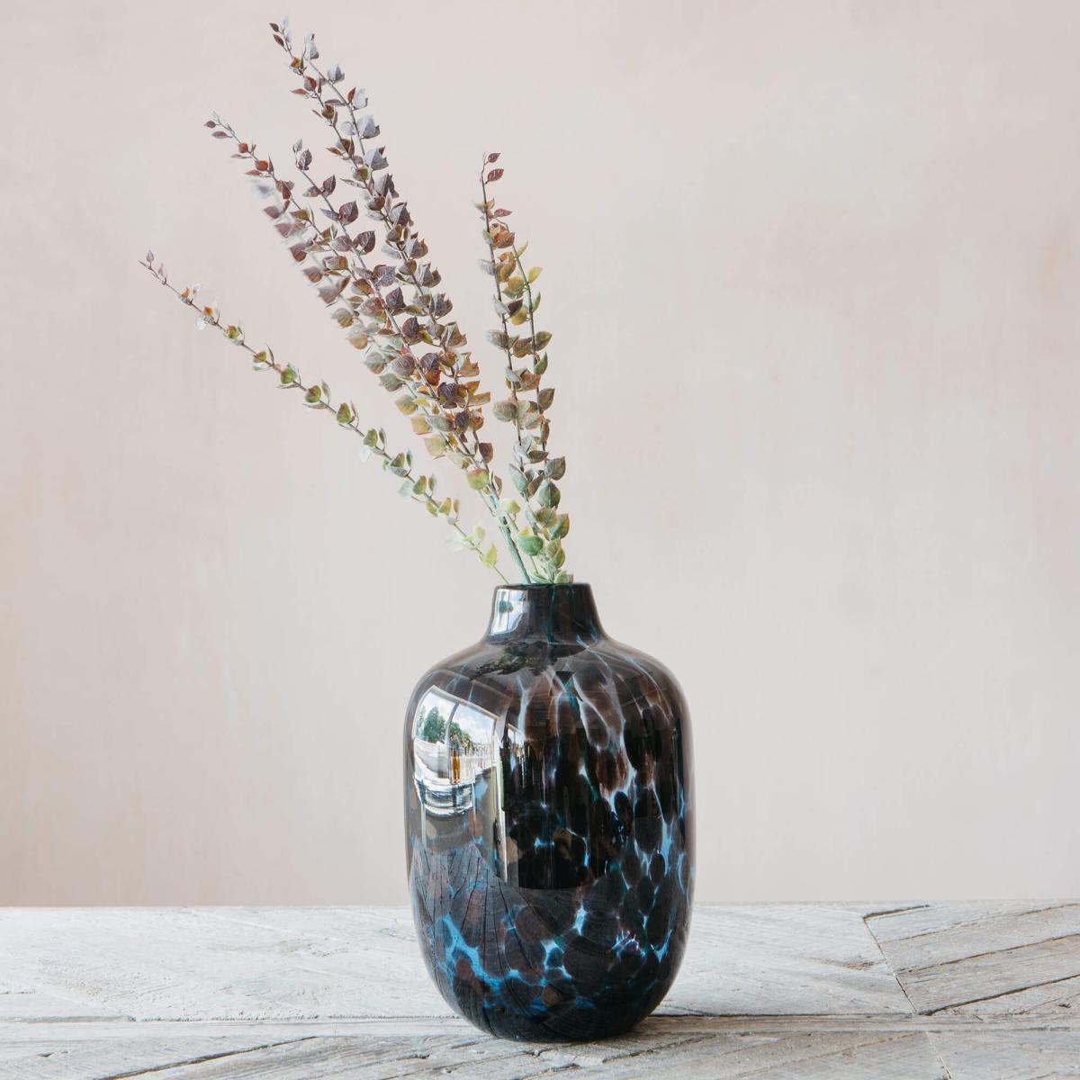 Splashed with an inky pattern of navy on coastal blue, this glass vase is a dramatic centrepiece for your console table or mantlepiece. Complement the moody hues with sprigs of sea holly and silvery eucalyptus.