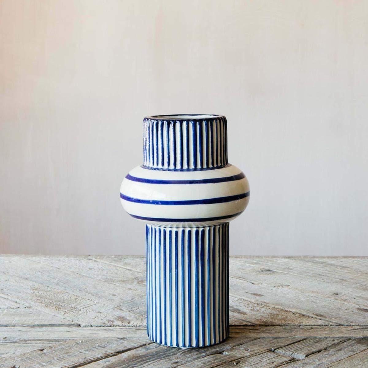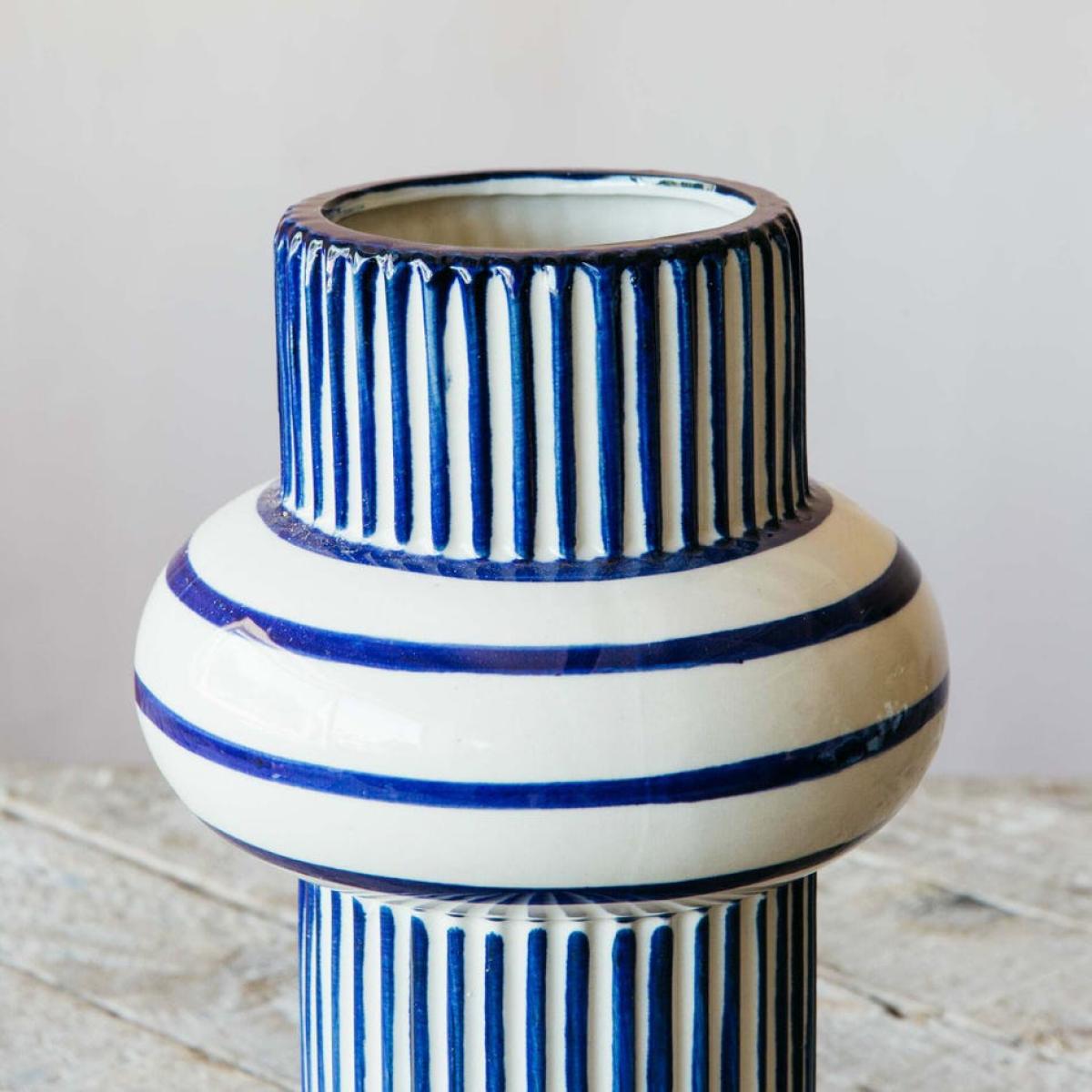 Refresh your home with flowers and the coastal blue pinstripe of this abstract shaped vase with a rounded lip. H28 x Diameter 18cm. Made of ceramic. Suitable for fresh flowers. The exact colour and finish will vary.
