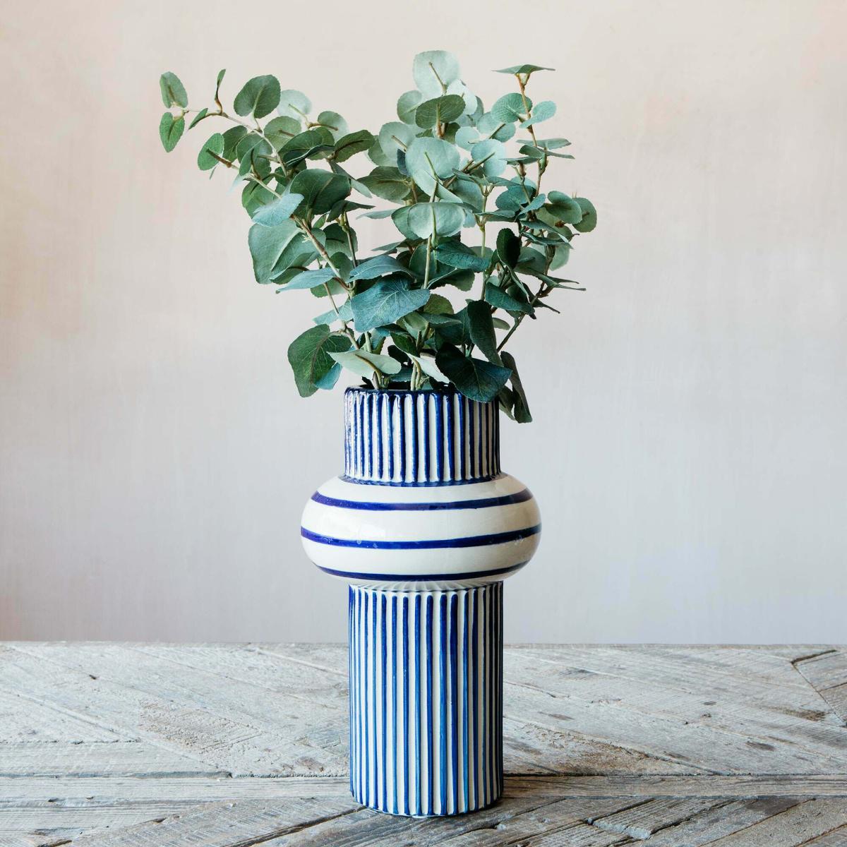 The blue striped vase is a versatile piece that adds a fresh, contemporary touch to both modern and traditional interiors. I love how it combines pattern and colour in a way that’s understated yet impactful. It works particularly well in minimalist settings when paired with lush green foliage, like eucalyptus, for a pop of colour and texture. For practical styling, try mixing it with other blue tones or placing it on a neutral surface to highlight its pattern. It’s also ideal for creating a focal point in a hallway or living room, and because of its striking design, it can stand alone as a statement piece without the need for additional accessories.