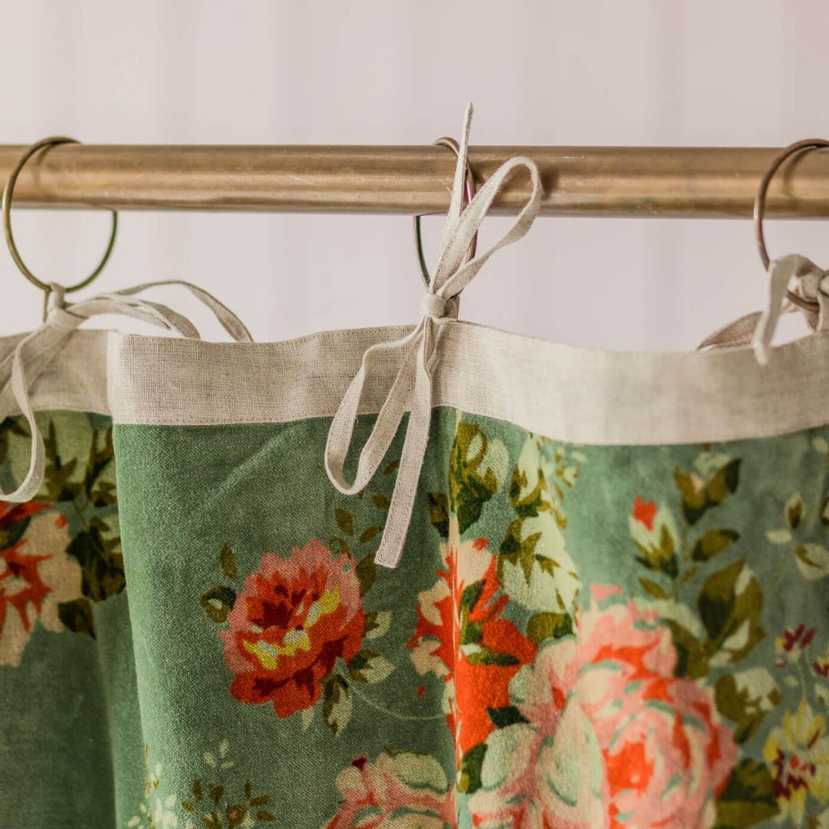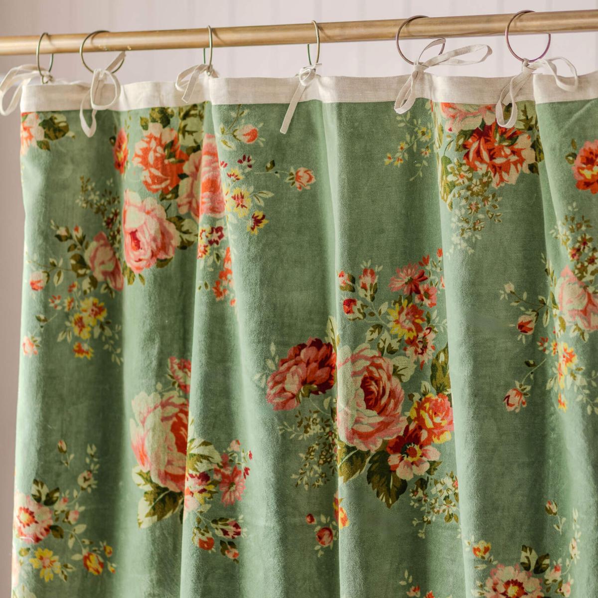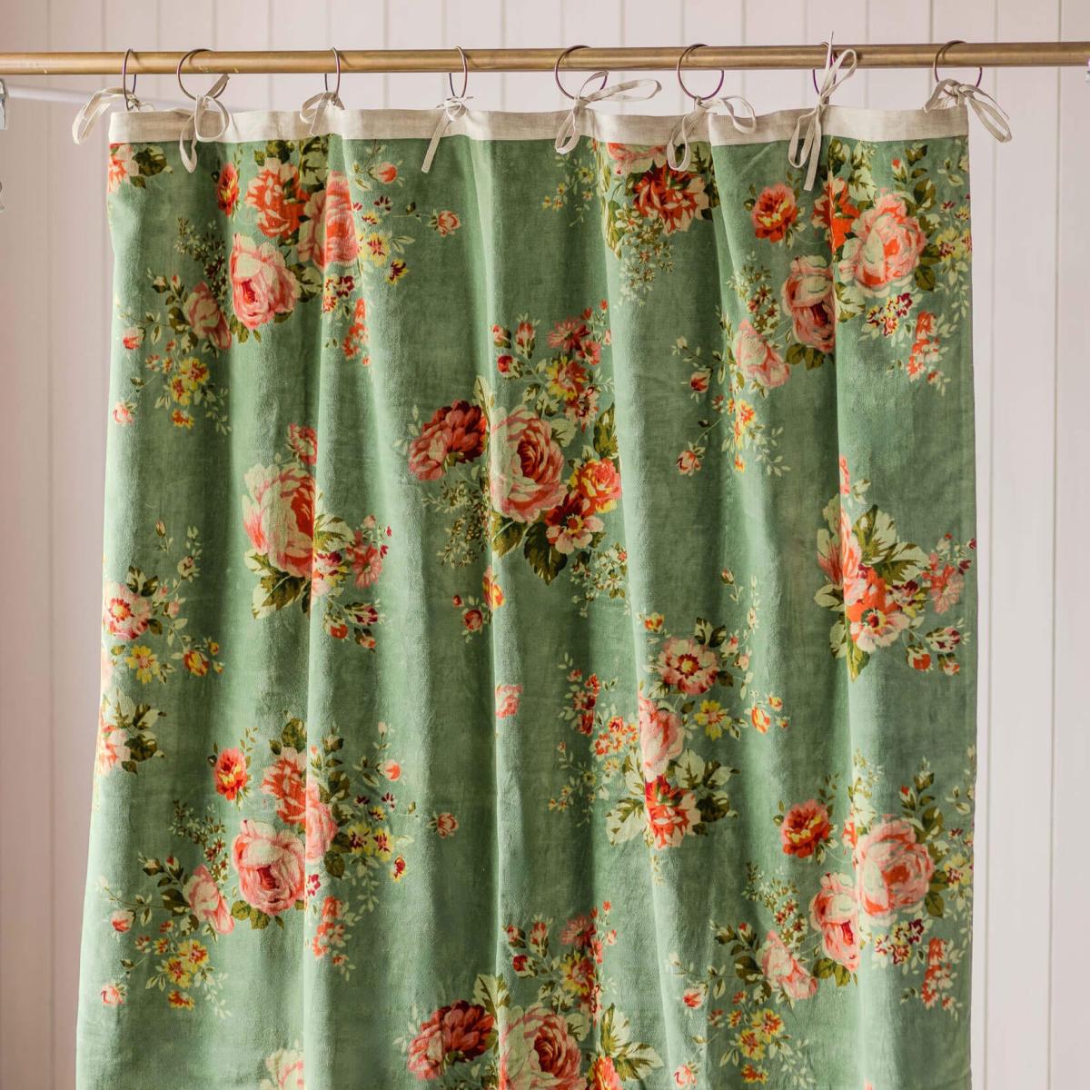 Covered in an elegant floral print, these Bouquet curtains are perfect for adding a cosy feel to a sitting room or bedroom. Crafted from sumptuously soft cotton velvet with a dark sage green base, ideal for complementing a maximalist home.