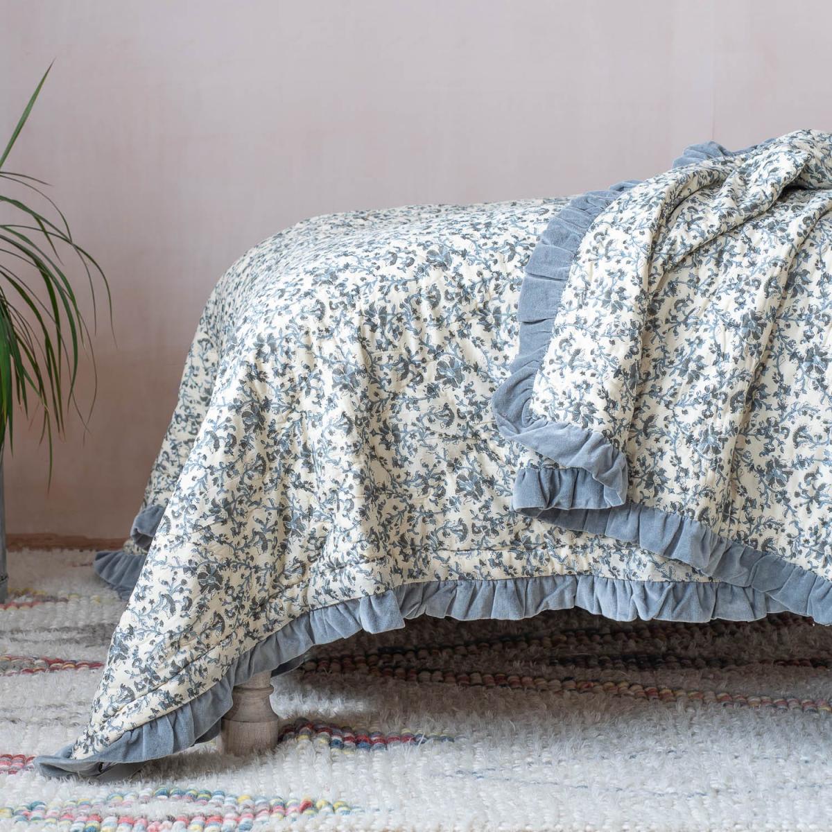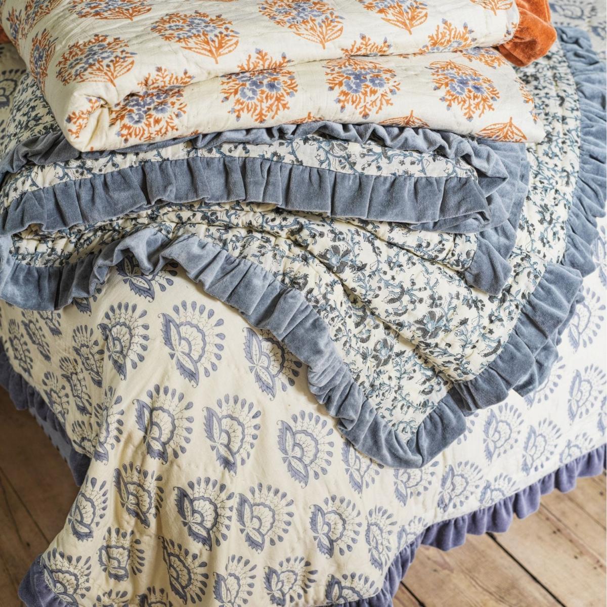 Expertly hand-block printed using traditional techniques, where the design is hand-carved into a wooden block and carefully pressed onto soft cotton fabric. Designed to fit up to a king-sized bed, each quilt is finished with a velvet trim that beautifully complements the intricate floral pattern.