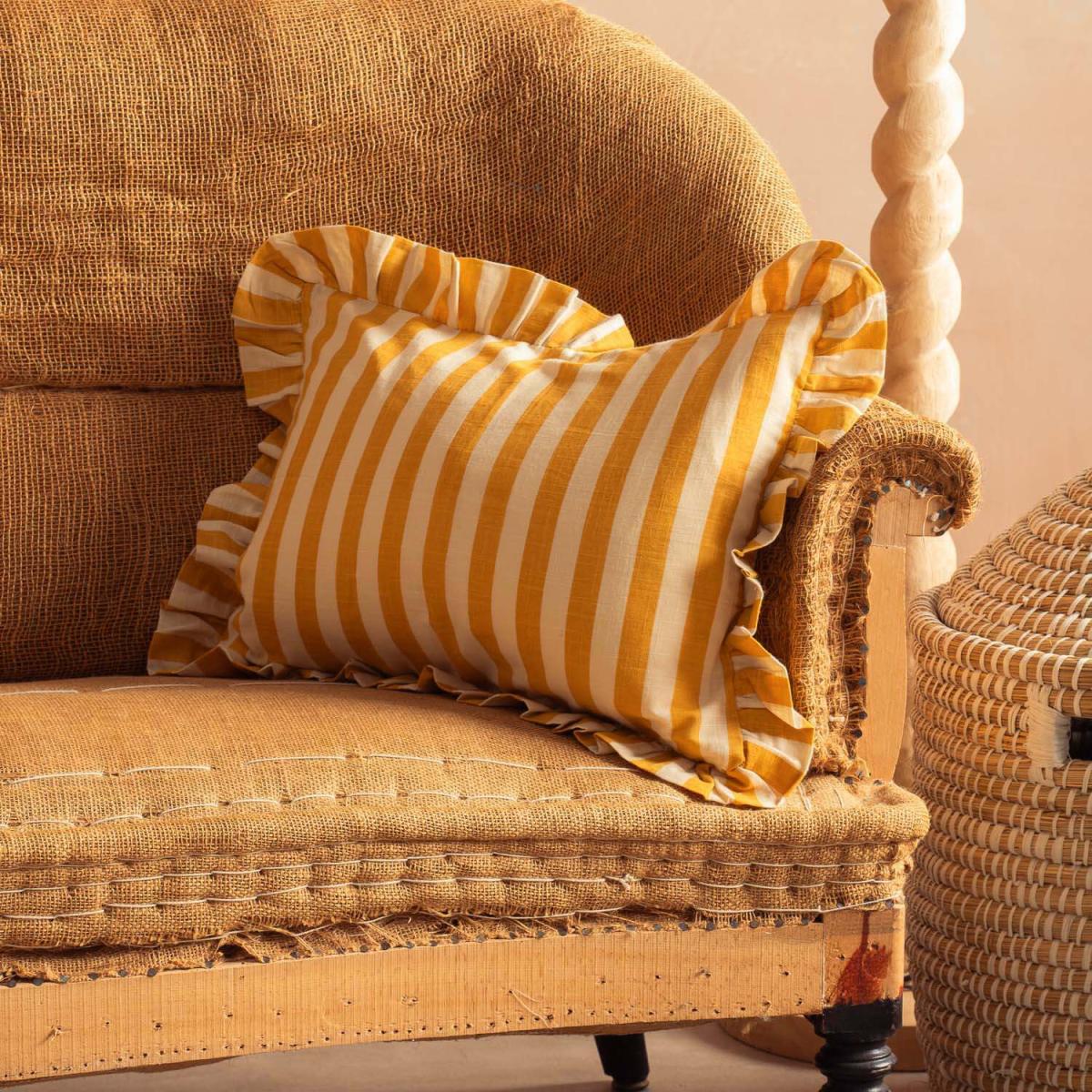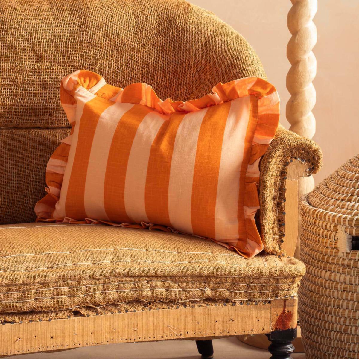 Bring the spirit of summer indoors with these brightly coloured rectangular cushions. Each one features a bold candy stripe design, complemented by a pretty frilled edge. Perfect for adding a pop of colour to a natural linen sofa or enhancing a dopamine-decorated home.