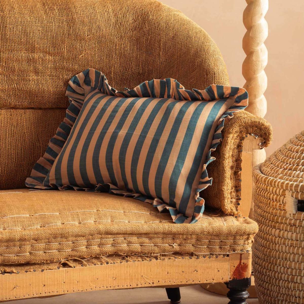 Bring the spirit of summer indoors with these brightly coloured rectangular cushions. Each one features a bold candy stripe design, complemented by a pretty frilled edge. Perfect for adding a pop of colour to a natural linen sofa or enhancing a dopamine-decorated home.
