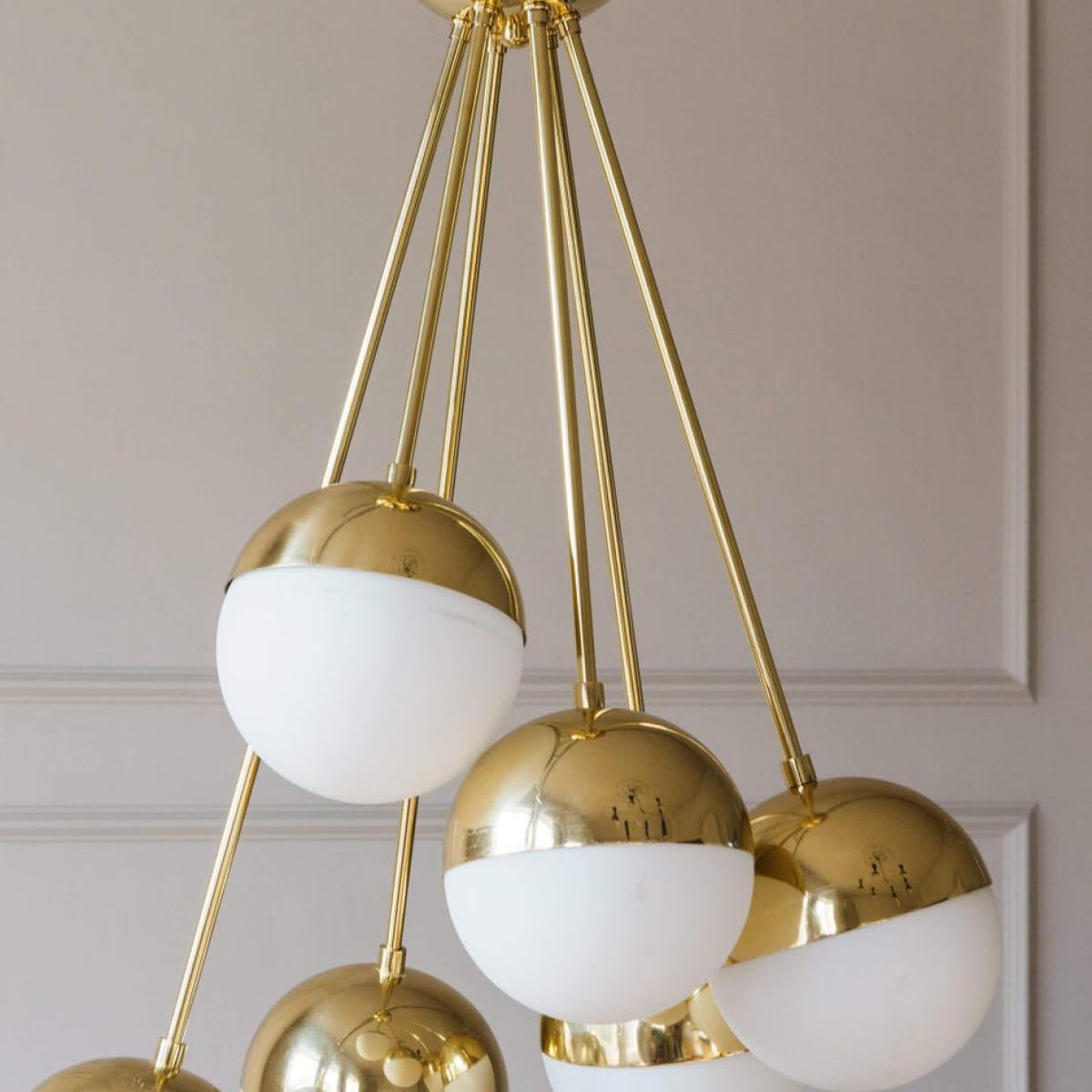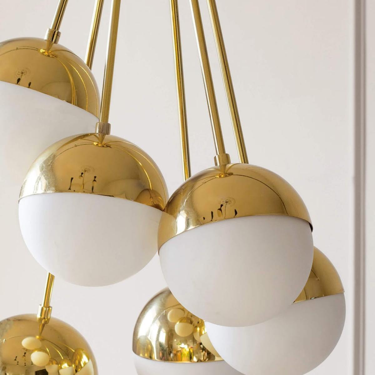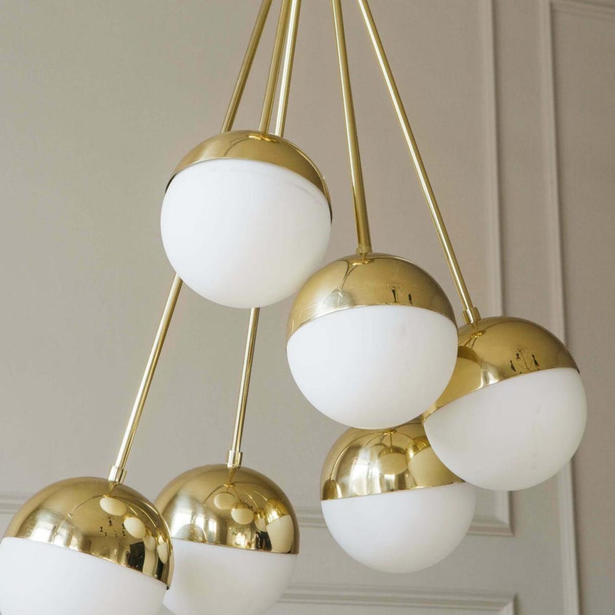 The unusual asymmetrical silhouette of this chandelier will cast a striking silhouette in any midcentury-inspired home. The cluster of glass globes are perched on rods of brass and each features a covered top to gently diffuse light around the room.