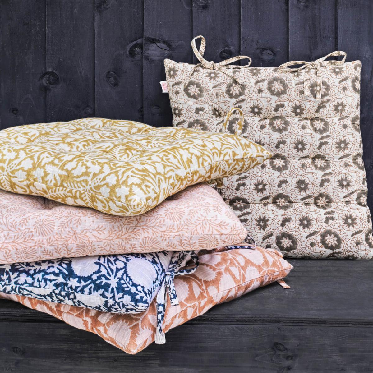 Traditional block printing techniques are used to create the delicate floral patterns on these pure cotton seatpads. Each one is made in Jaipur, India, and filled with recycled cotton for a comfortable, sustainably made design. They are complete with coordinating ties ready to attach to your dining chairs.  W45 x D45cm. Traditionally block-printed cotton with recycled cotton inners. Spot clean only. Size may vary slightly due to the handmade nature of this product. Sold individually.