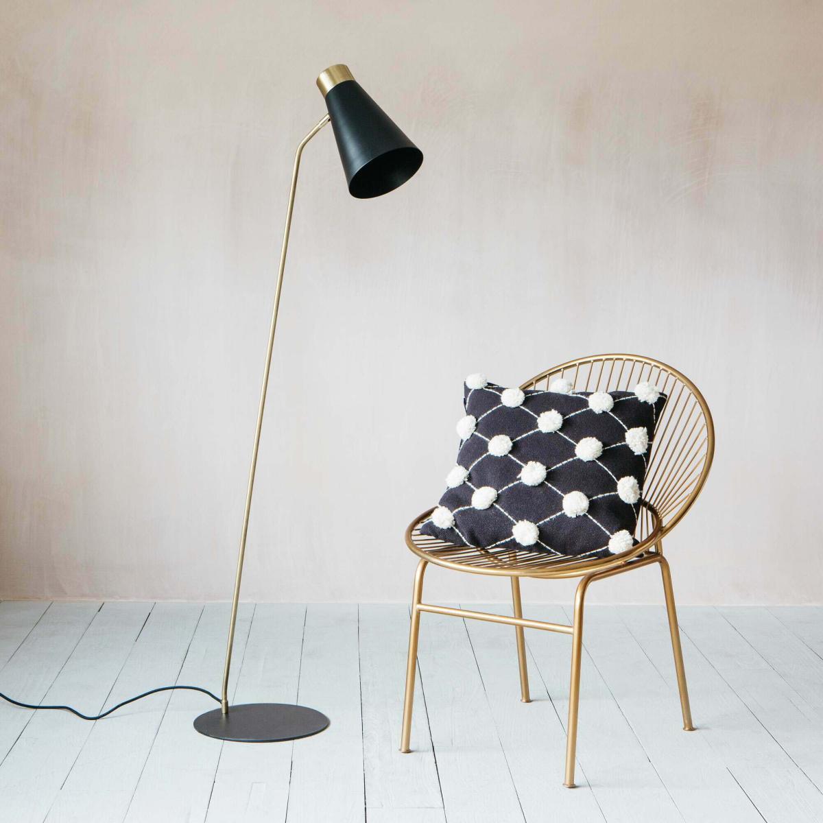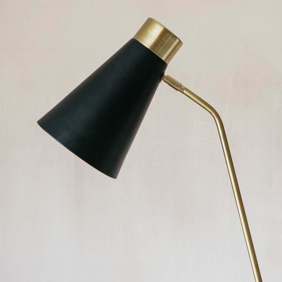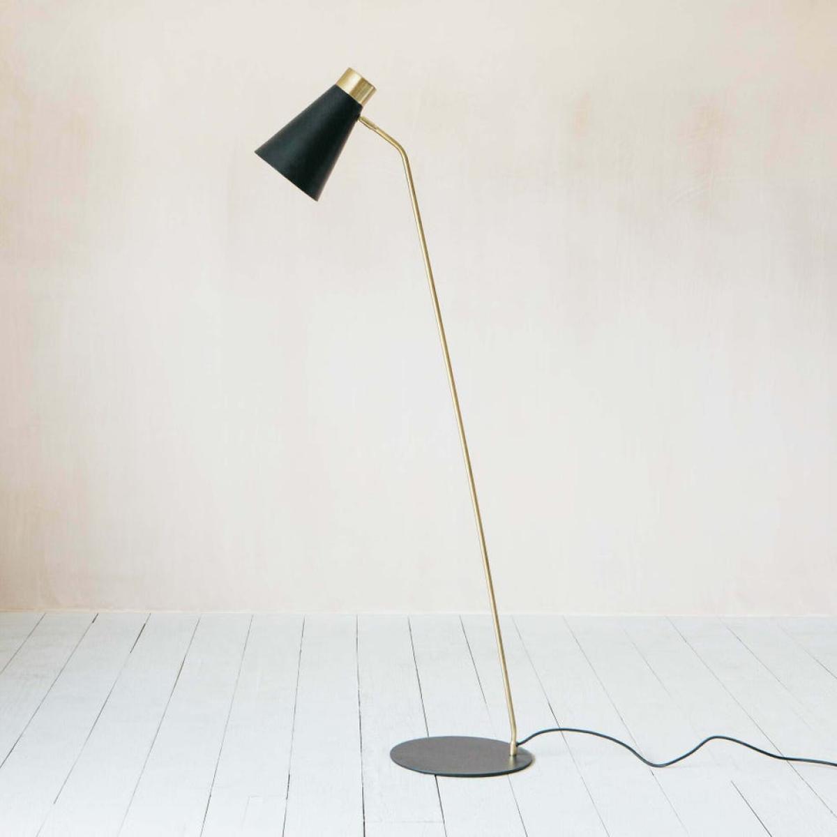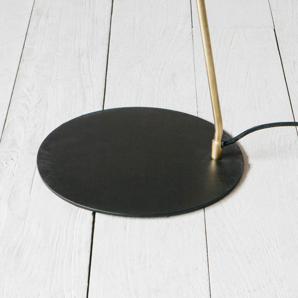 Light up your contemporary home with this sleek black floor lamp made of iron with a band of brass detailing and fine gold stem. Style your home office with the matching table lamp for a minimalist aesthetic.