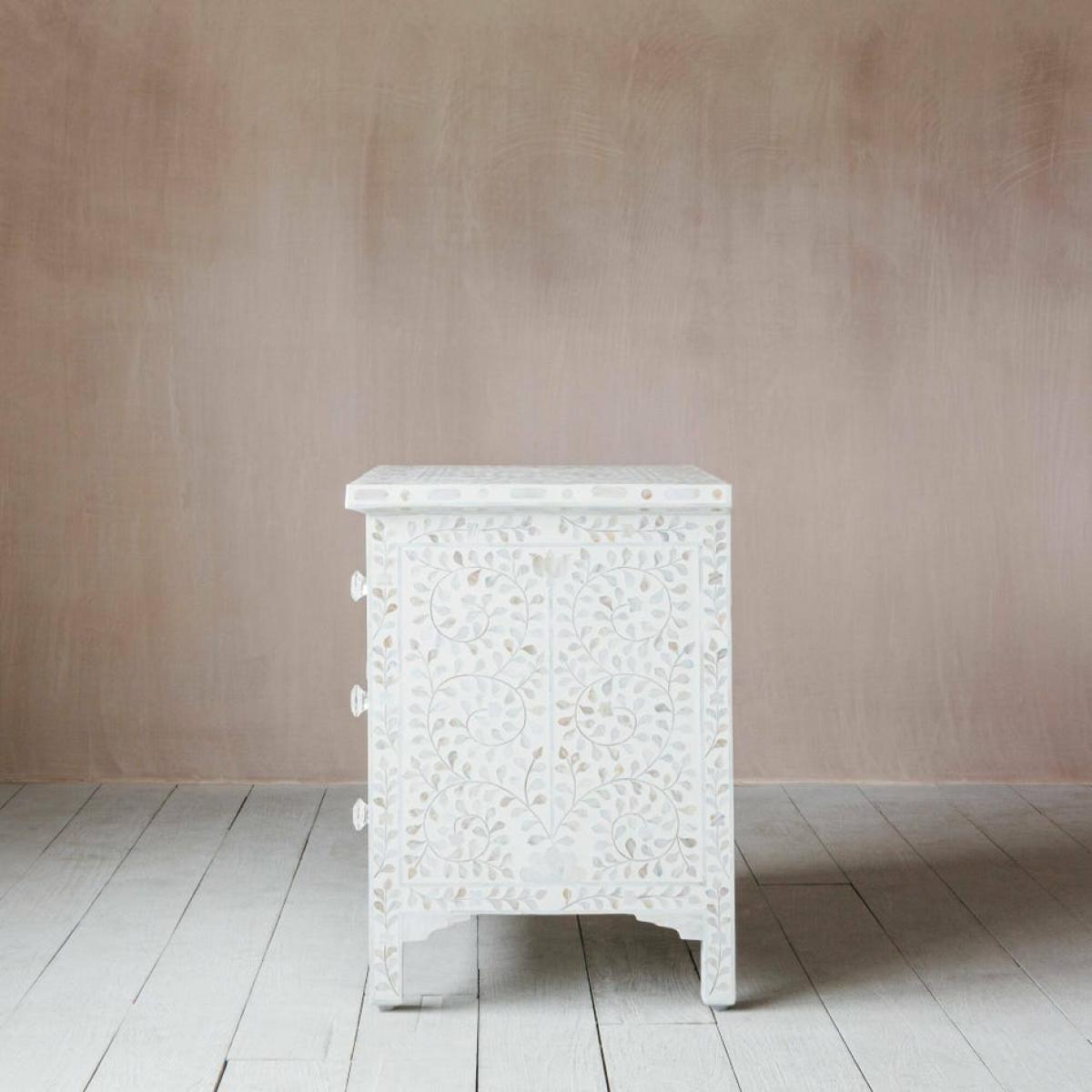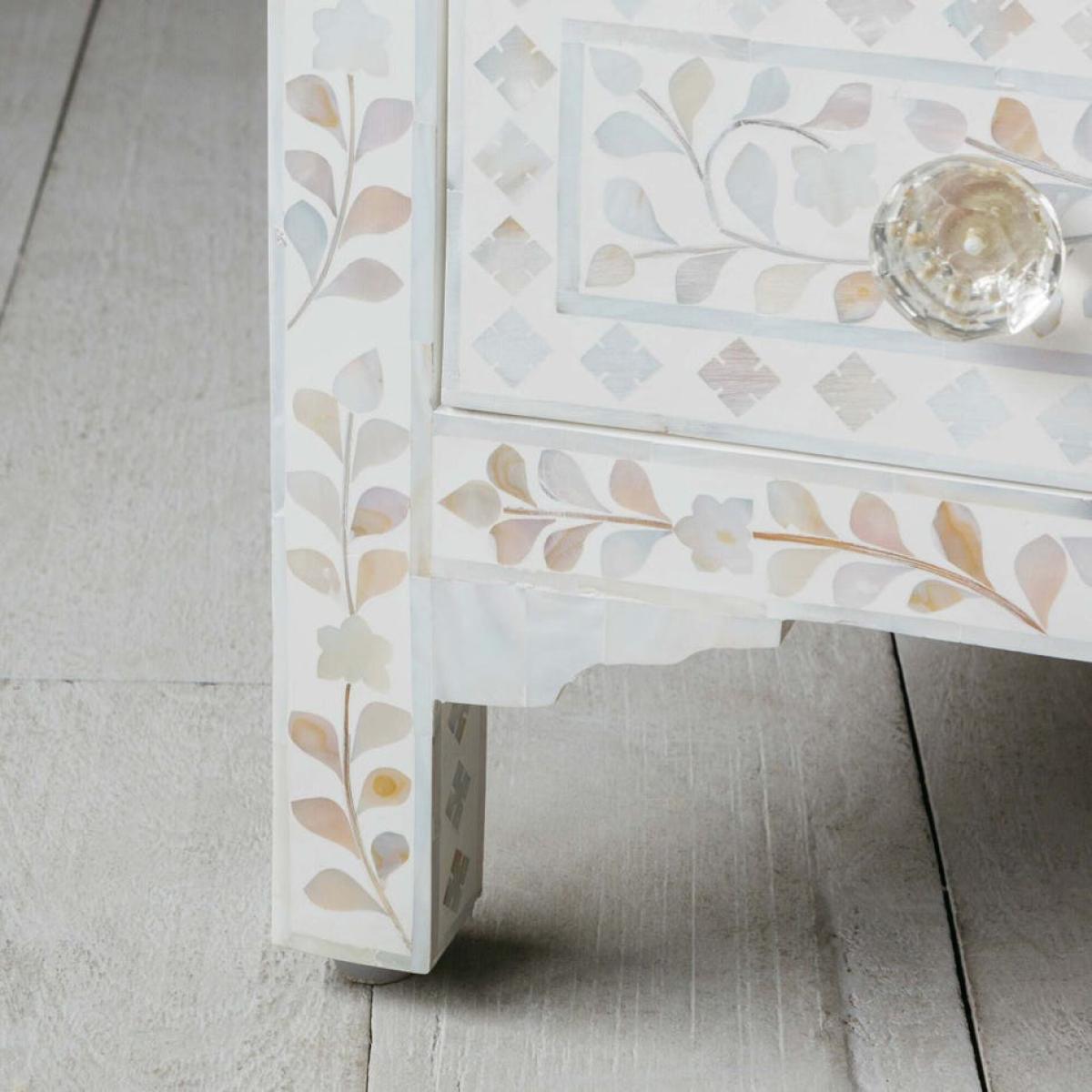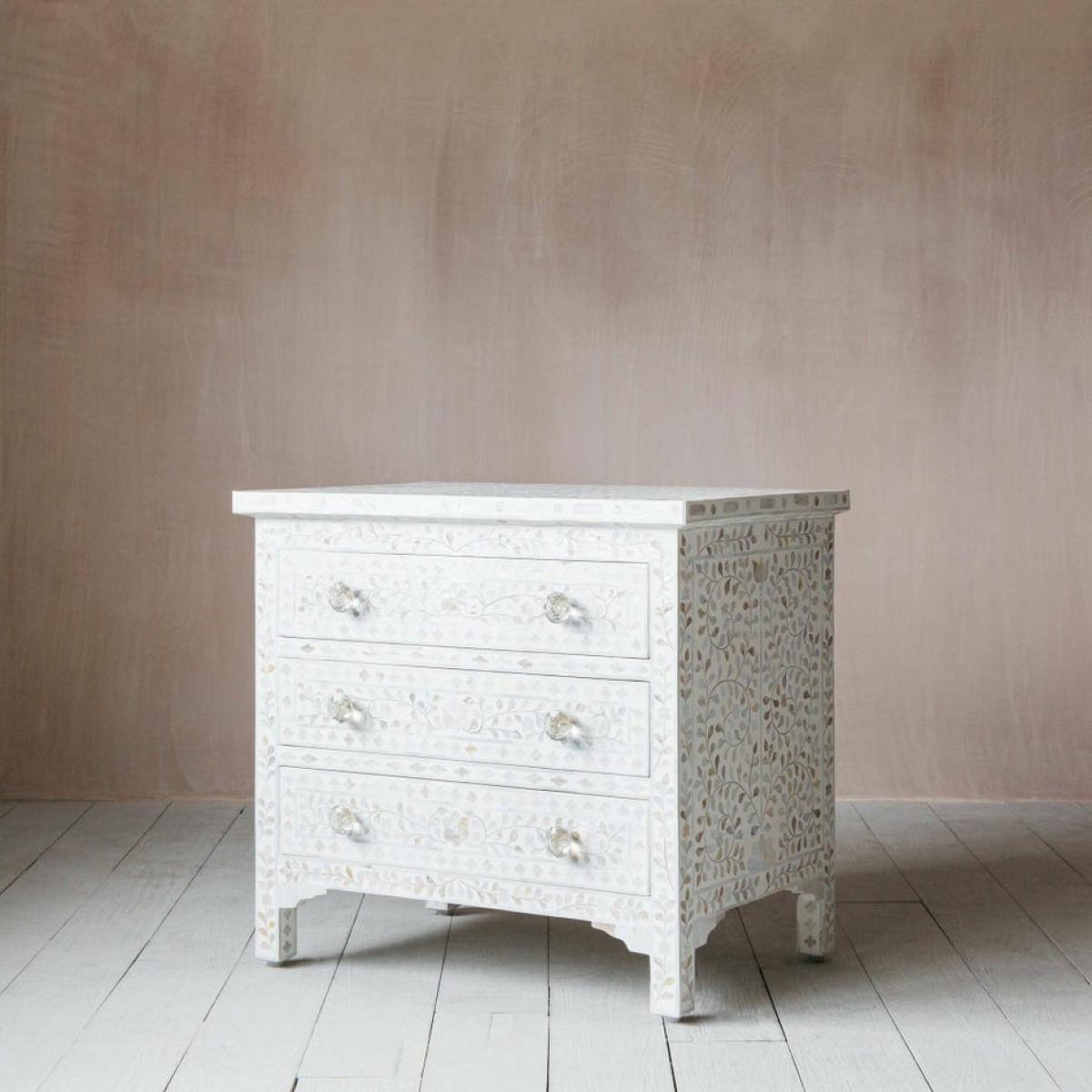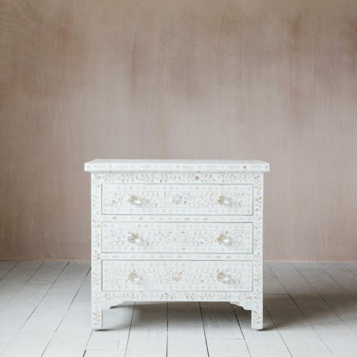 Our Classic White Mother of Pearl inlay large chest of drawers is exquisitely handcrafted in Jaipur by a team of skilled artisans, individual pieces of mother of pearl are hand-carved then fixed into brilliant white resin to create a beautiful floral design. Now in a larger size with three generous drawers to invite luxurious sanctuary in your bedroom.
